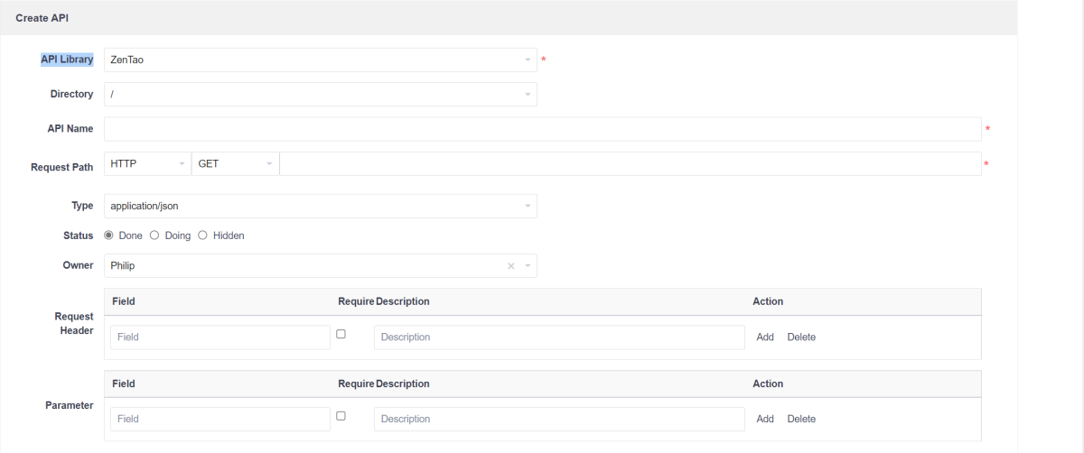 Click the Create API button in the middle of the page, or the Create button in the upper right corner, to enter the API document creation page.