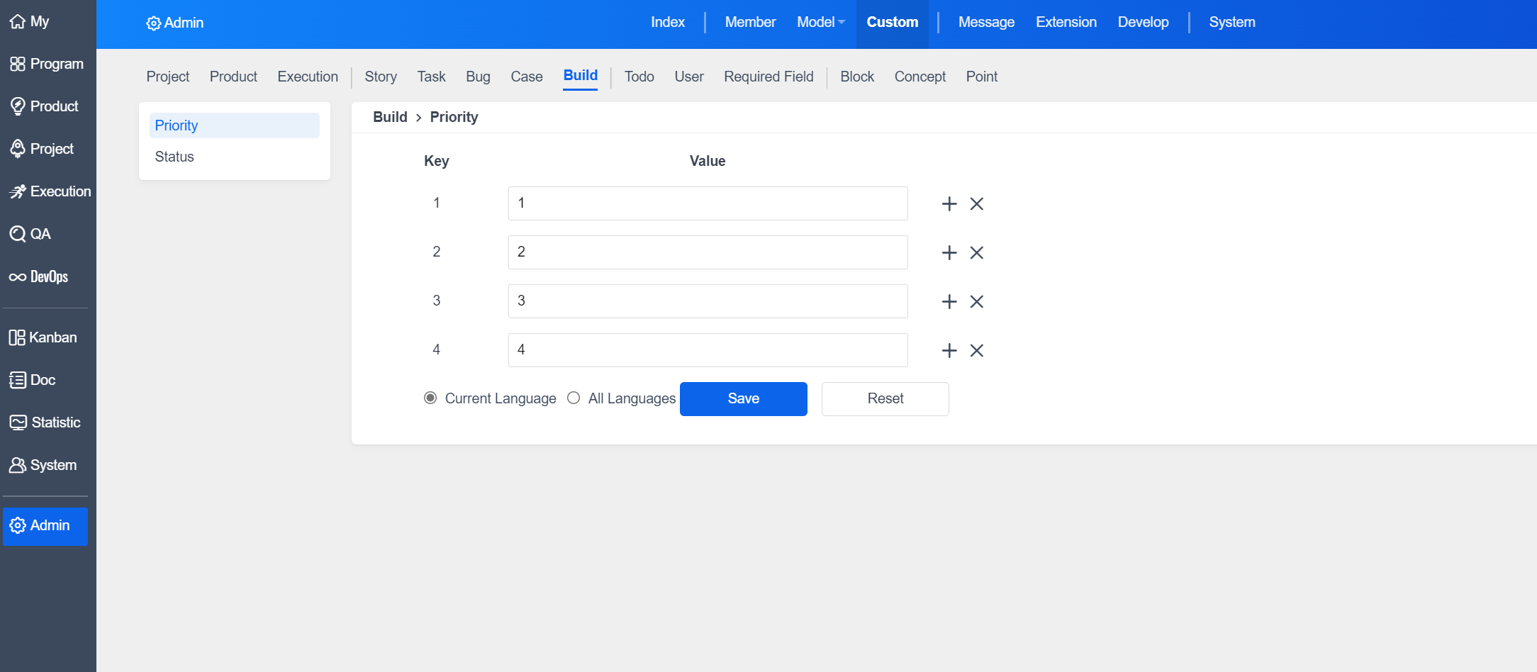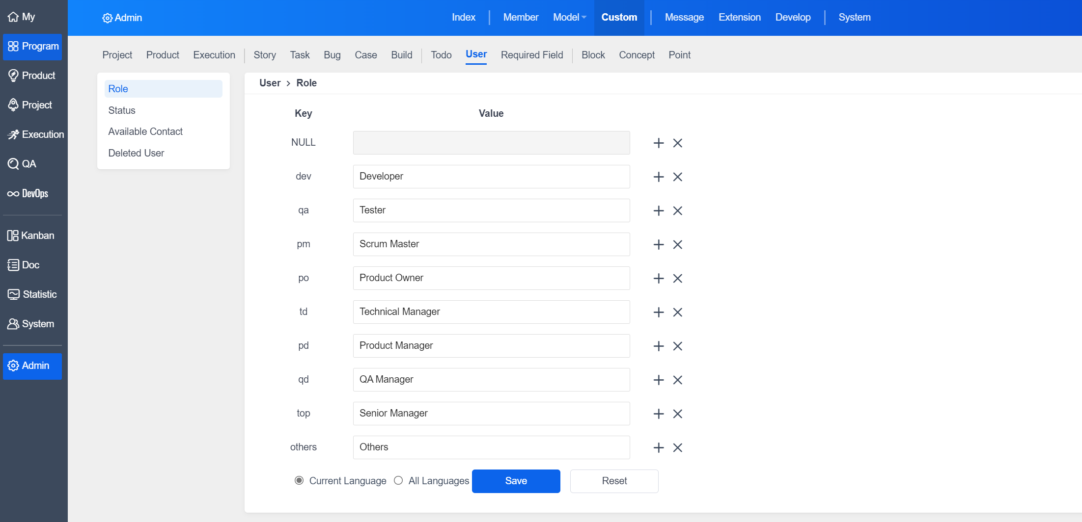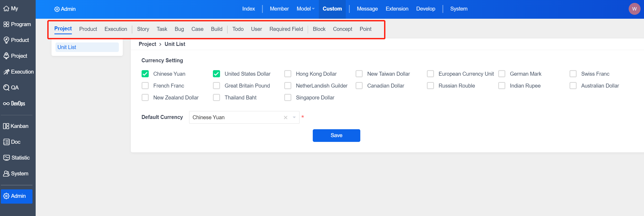 1. Set the project budget unit: Under "Custom" - "Project", you can set the unit of project budget. The default budget units in ZenTao system are RMB and USD.