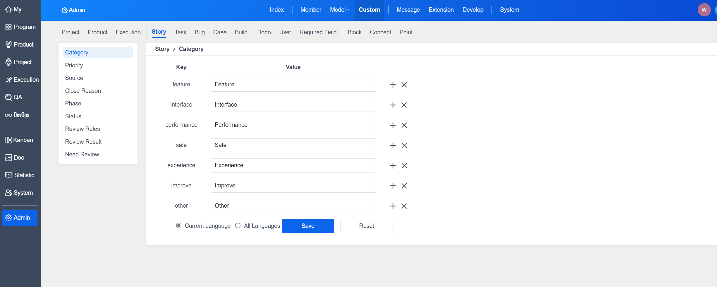 4. Customize R&D requirements: Under "Custom" - "Story", customize the fields related to requirements.