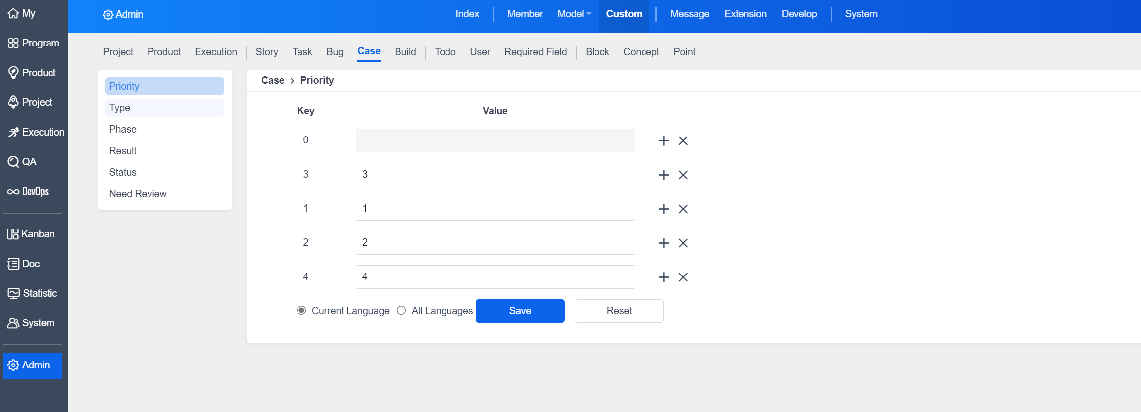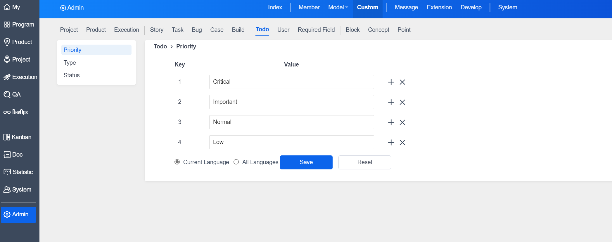 11. Required Field: Under "Custom" - "Required Field", you can set the required field on the main pages of ZenTao.