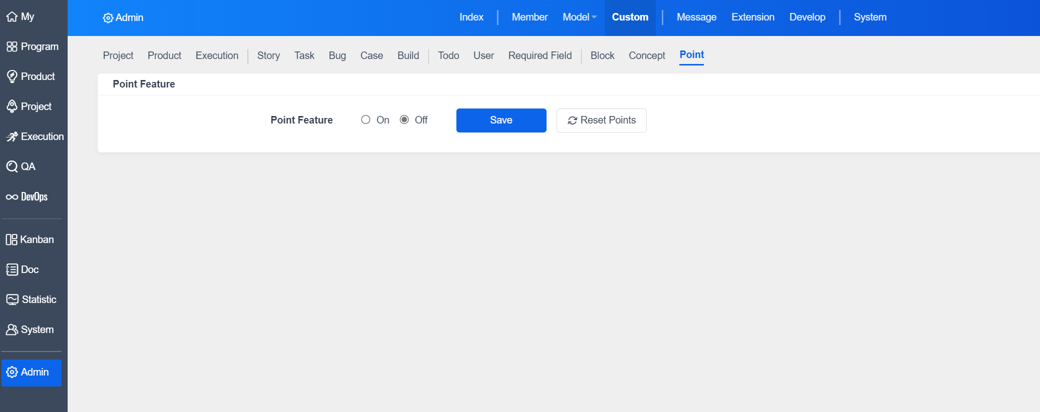 14. Points: The points function in ZenTao is to promote user activity. After enabling the points function, you can check the points rules in "My" - "Points" - "Points Rules".