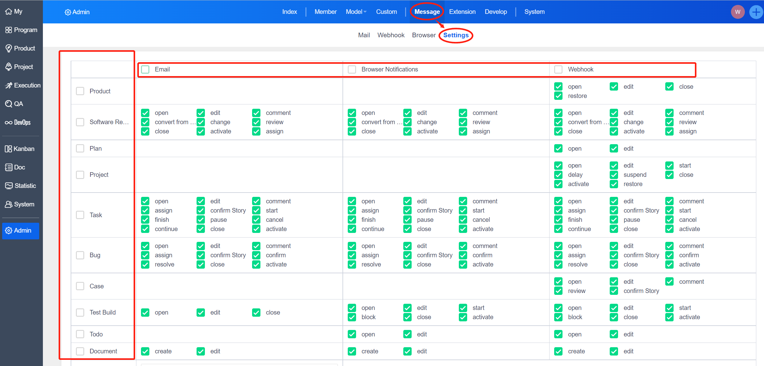 In “Admin”-“Message”-“Settings”, you can set the trigger actions for email, webhook, and browser notifications.