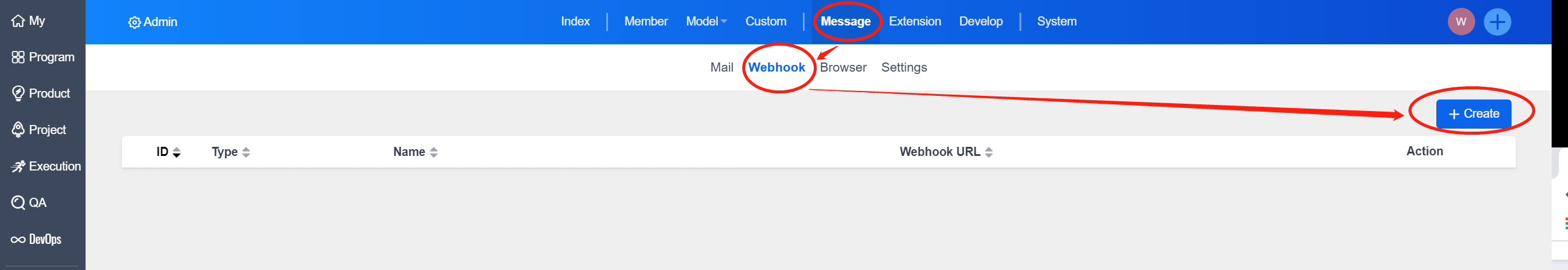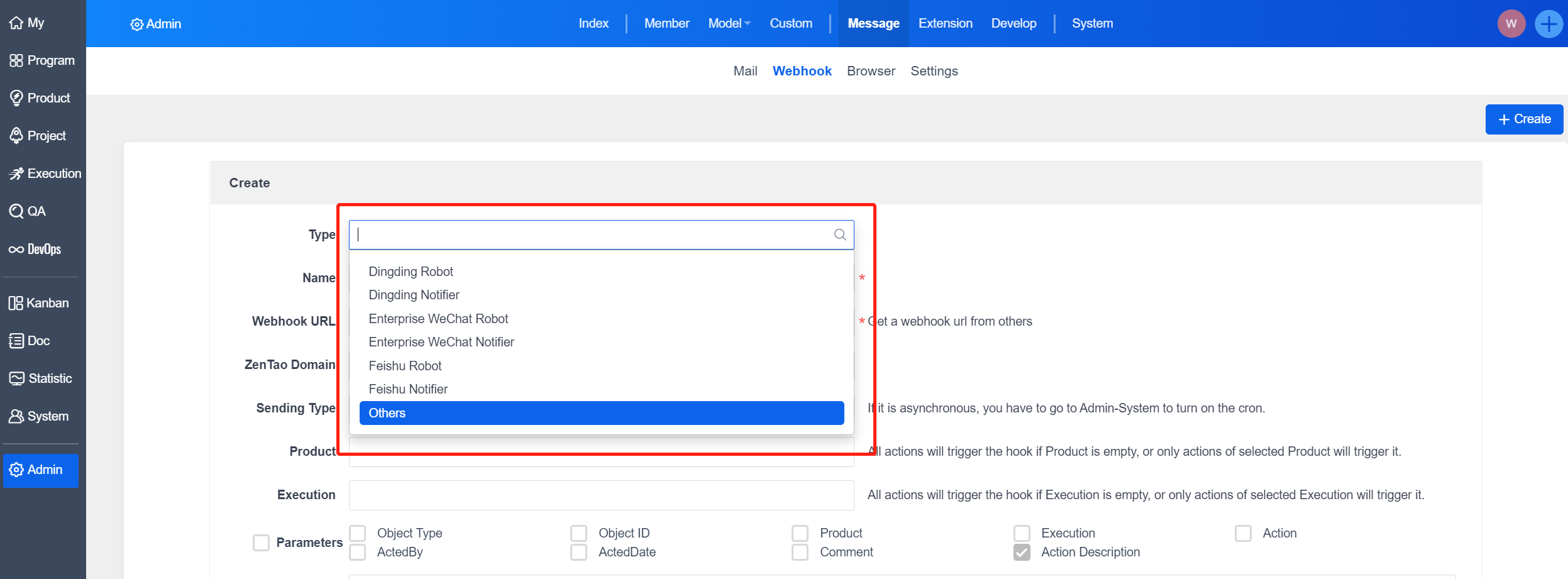 Trigger action: It refers to sending a message to the hook address when certain operations are performed. It can be set in "Background" - "Notification" - "Settings". If you are familiar with the secondary development based on ZenTao, you can modify this content by extending zentao/module/webhook/config.php file.