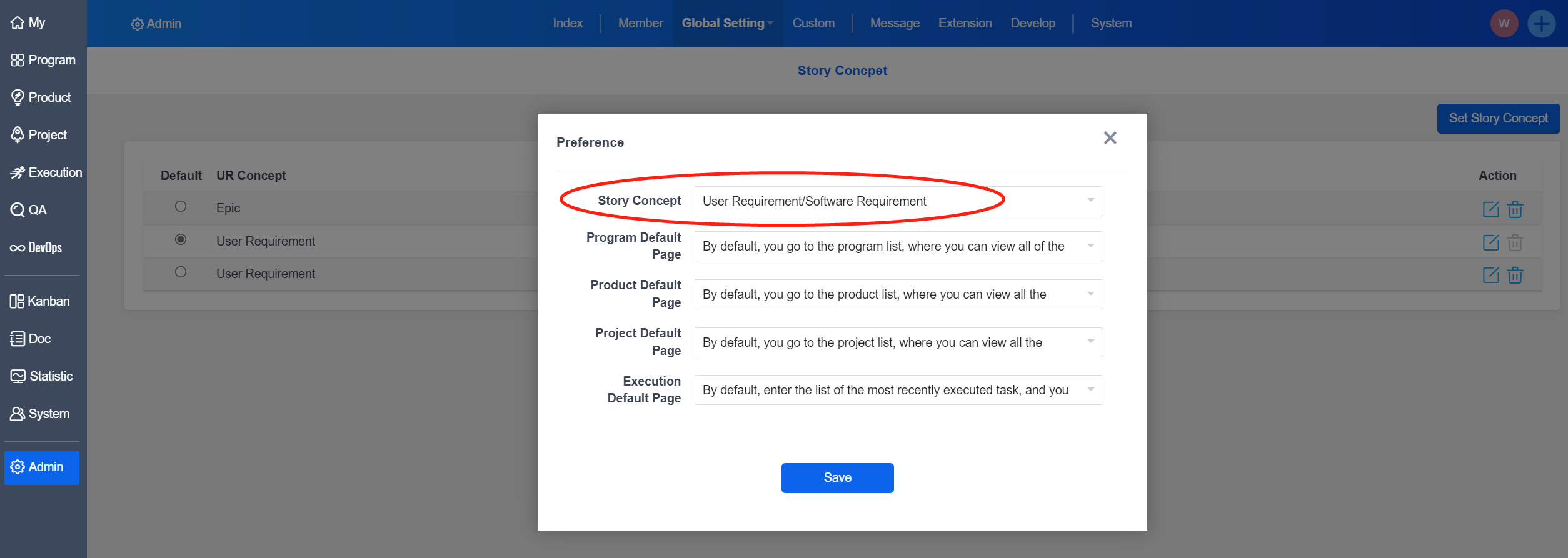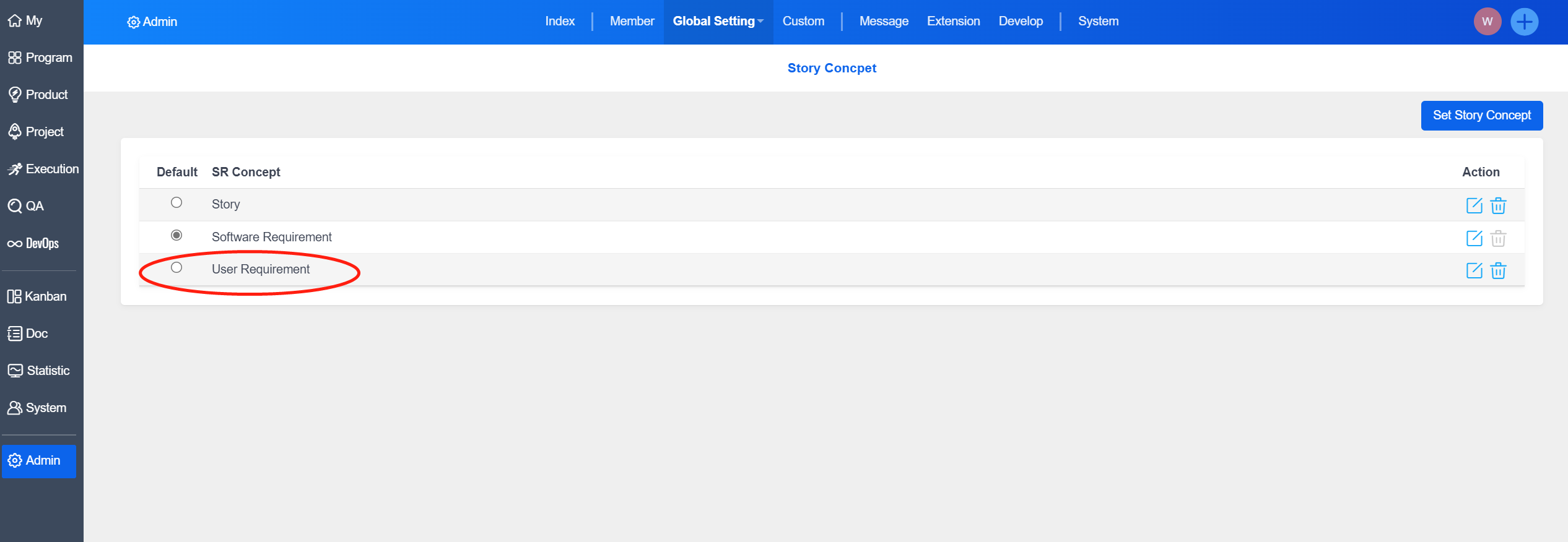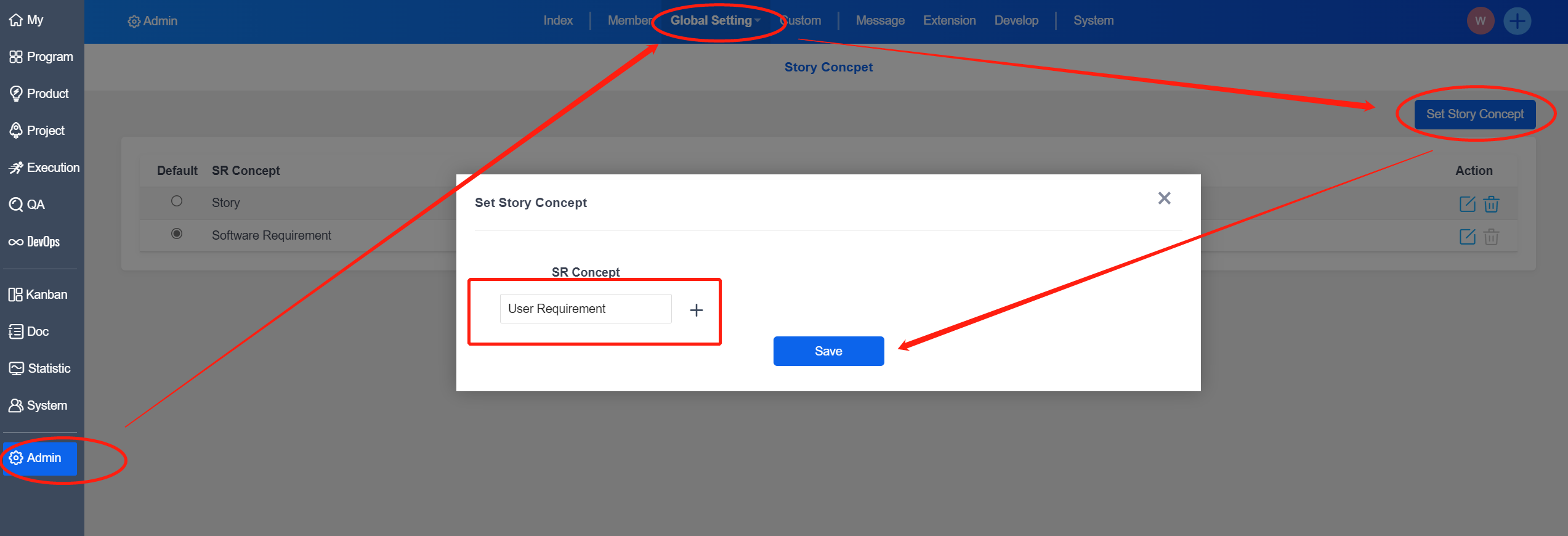 Under "Admin" - "Global Setting" - "Set Story Concept", administrators can also add requirement concepts. Click "Set Story Concept" and fill in the concept in the input box.