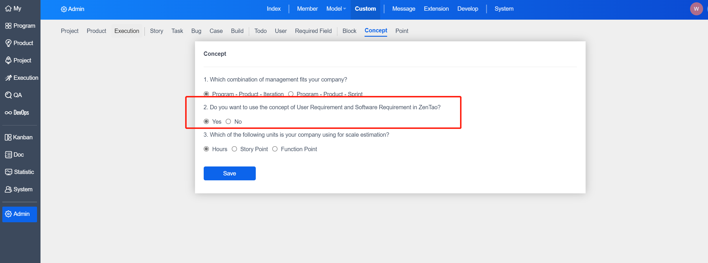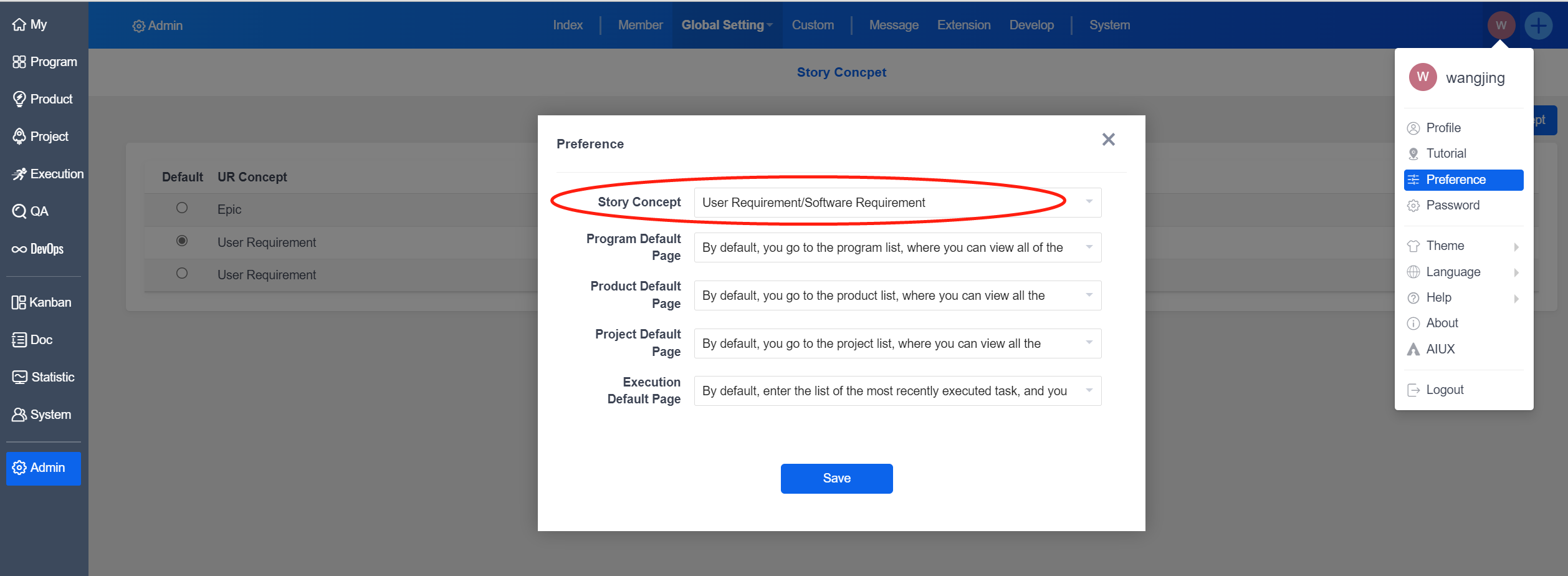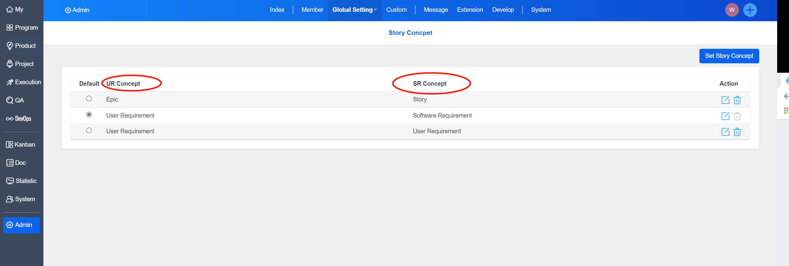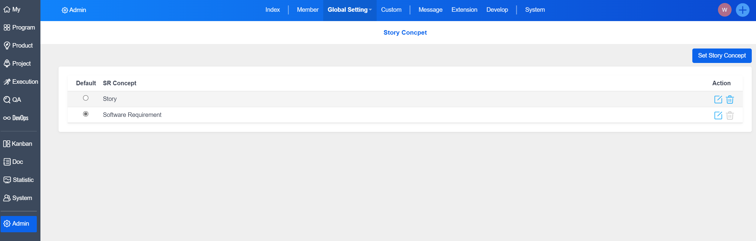 Under "Admin" - "Global Setting" - "Set Story Concept", administrators can also add requirement concepts. Click "Set Story Concept" and fill in the concept in the input box.