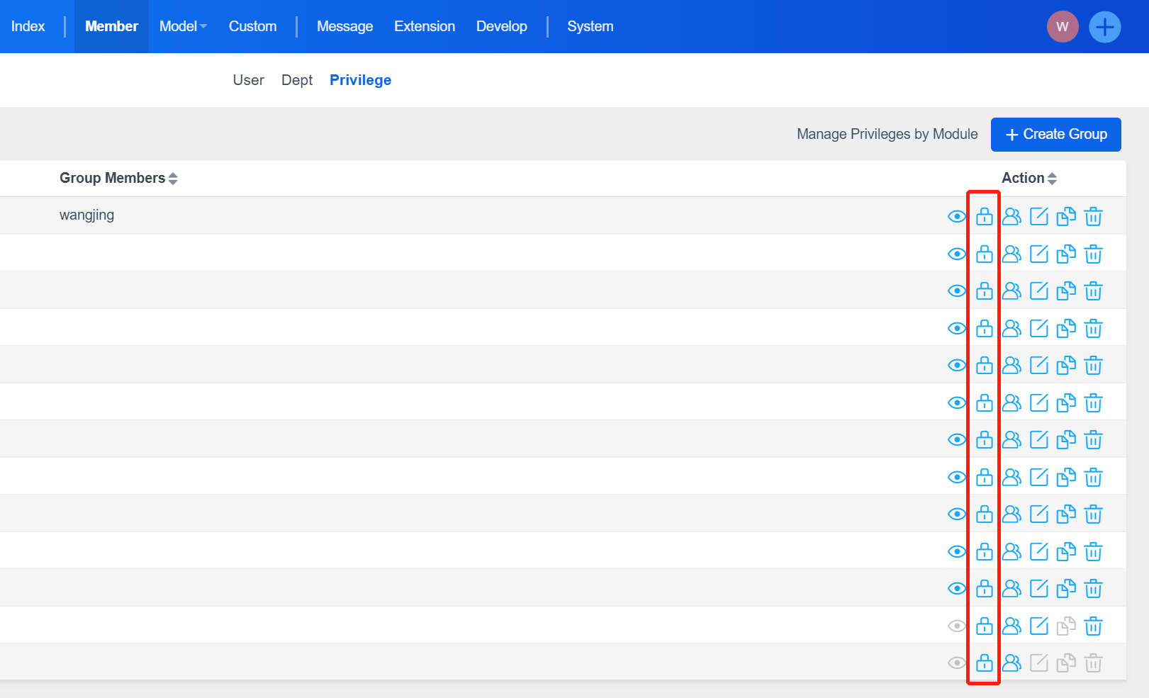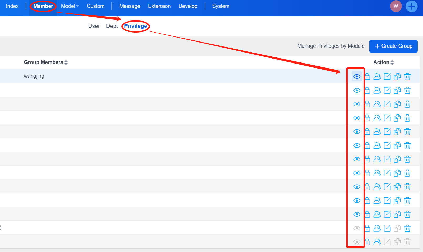 Click the "Manage Privileges by Group" button on the right side of the "Admin" - "Member" - "Privilege" to enter the privileges management page.