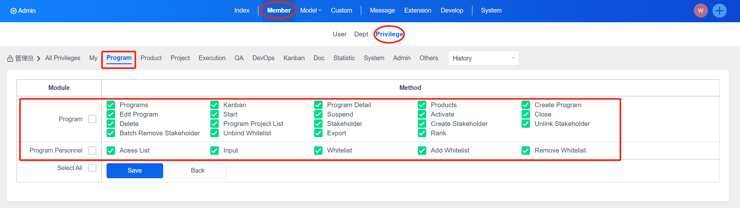 All privilege management of ZenTao is maintained under the "Admin" - "Member" - "Privilege".
