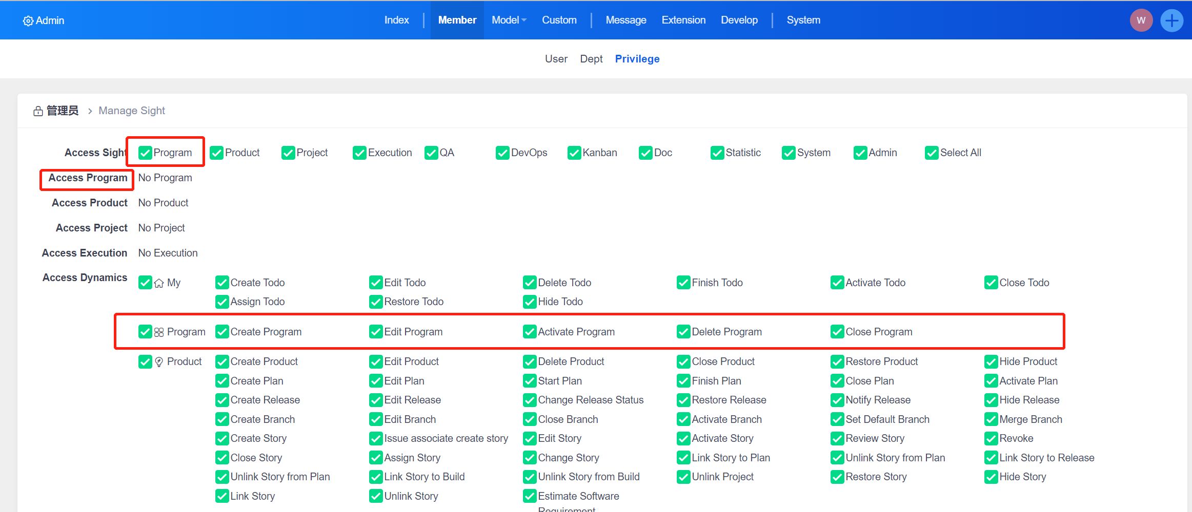 The privilege management page of the program sight: checked to assign permissions, unchecked it to not assign permissions.