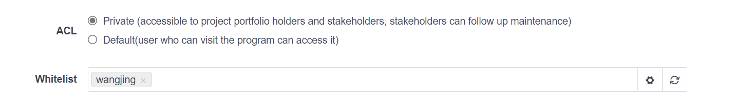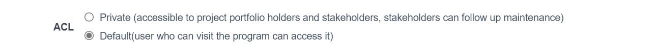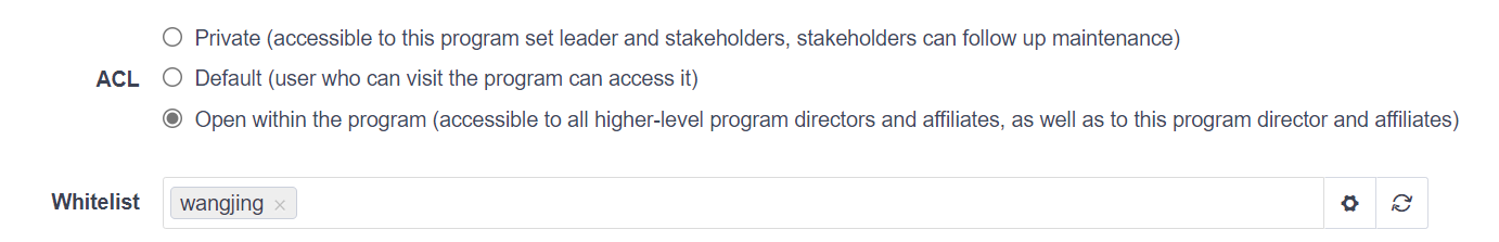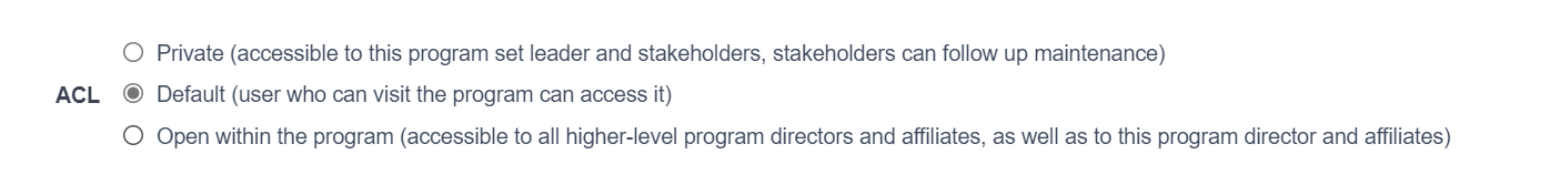 When creating a first-level program (parent program), the default access control is private,and a whitelist of users can be set under private.