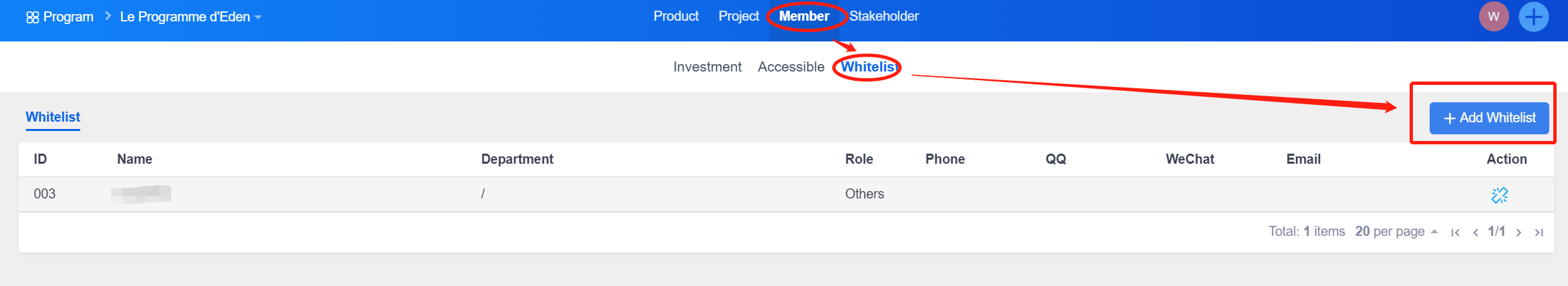 - Member: List contributors, accessible members, and whitelist. Accessible people are a collection of whitelists and stakeholders.