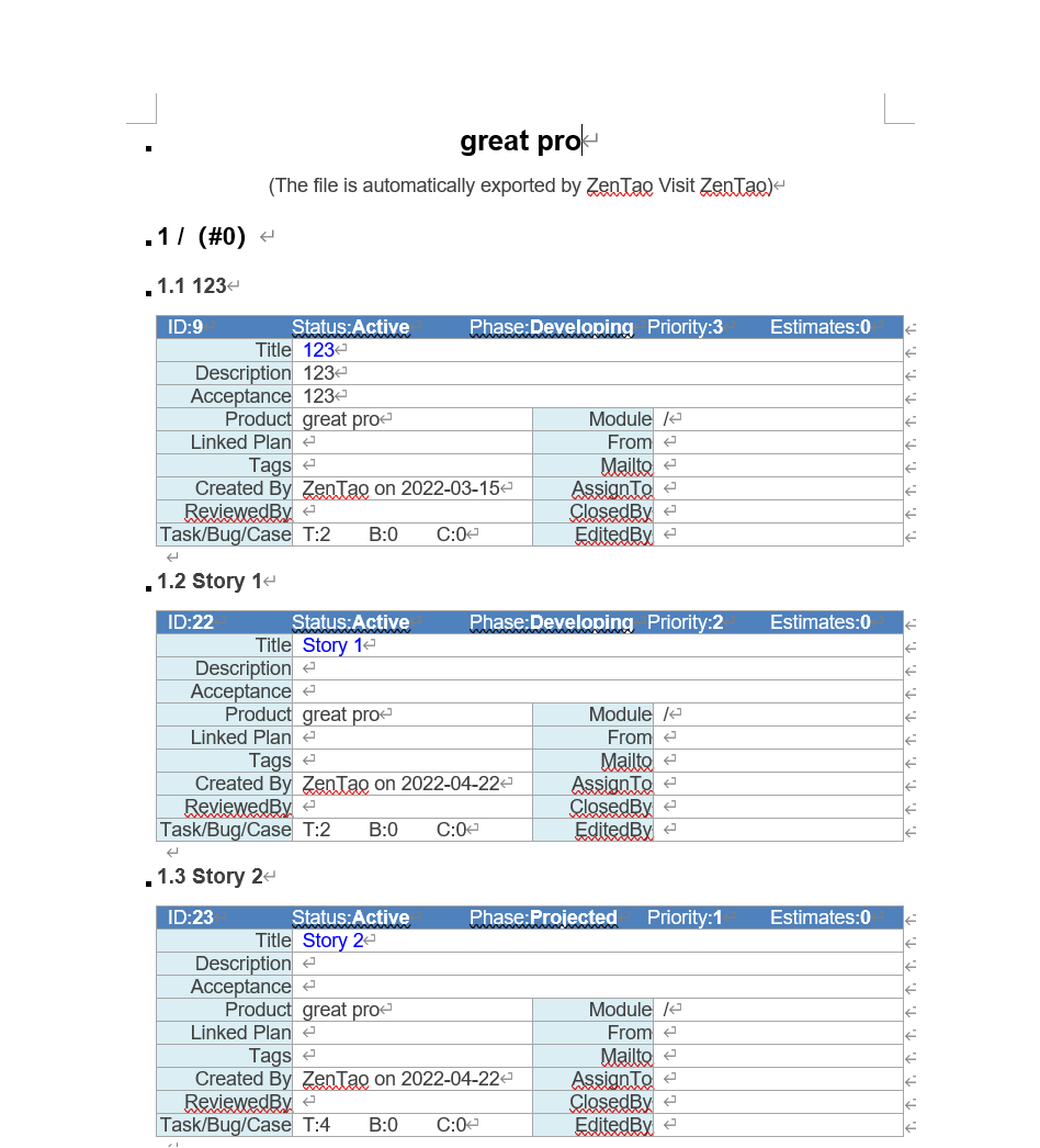 ZenTao Biz is available to export records to docx files with the help of the phpword library.