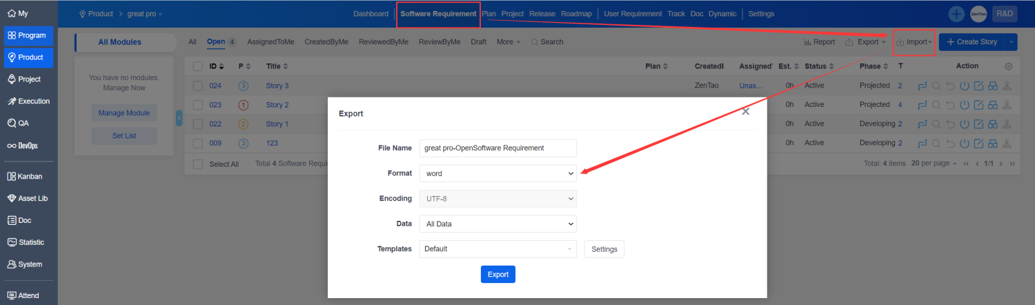Go to "Product"-"Software Requirement"-"Export"-"Export Data", and then select the format as word.