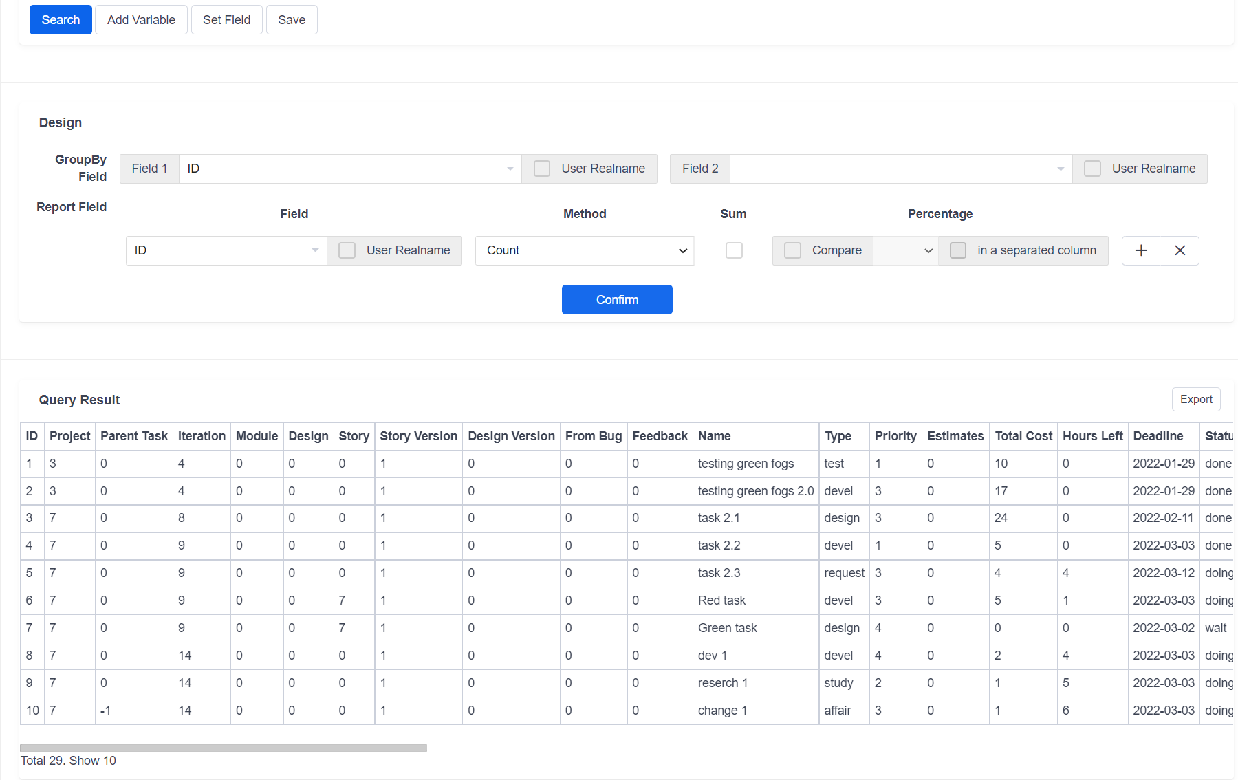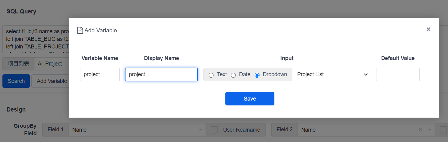 - Click "Design" to apply this report. If there are variables in the report, you need to enter the variables to view the report.