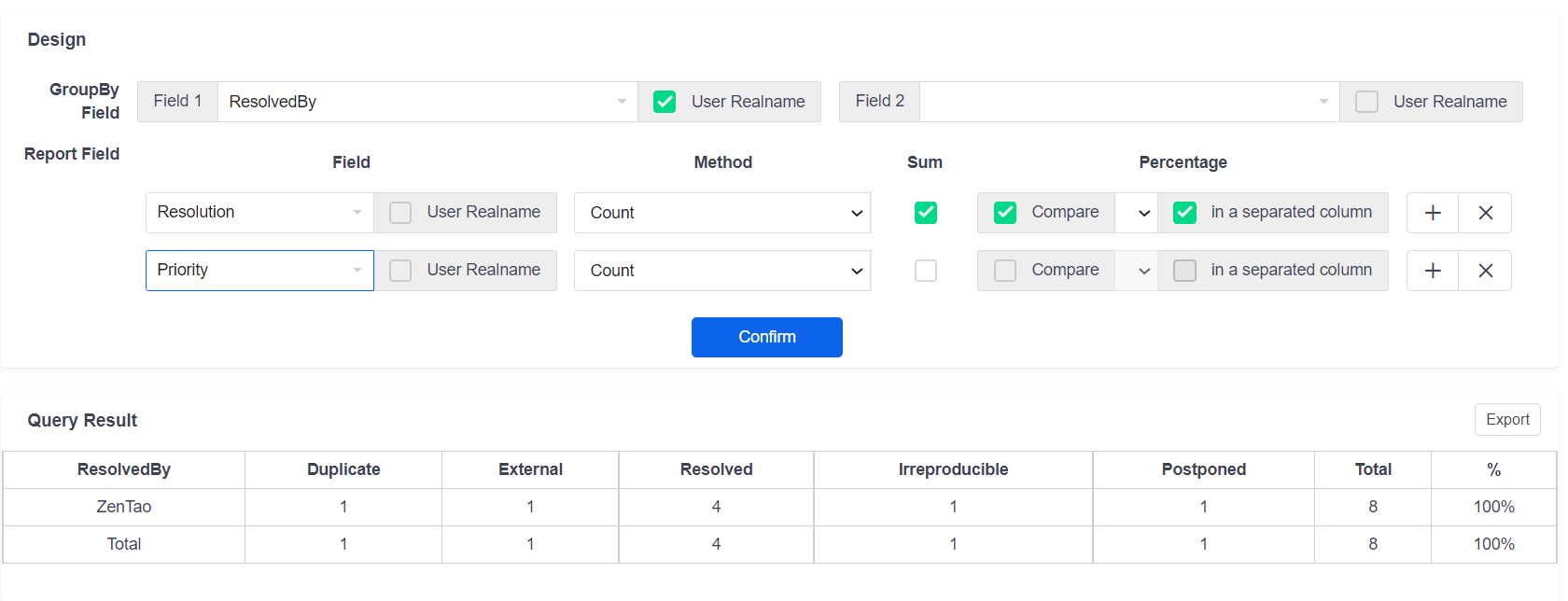 Report conditions can be designed as needed. The report is based on Group Field 1and Group Field 2 according to Report Field and Report Method. Field 1 is required, while Field 2 is optional.