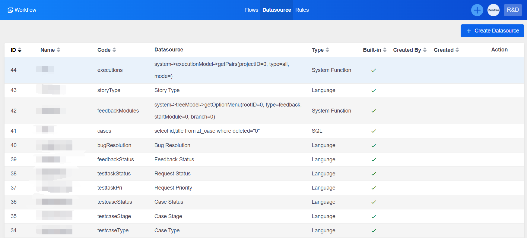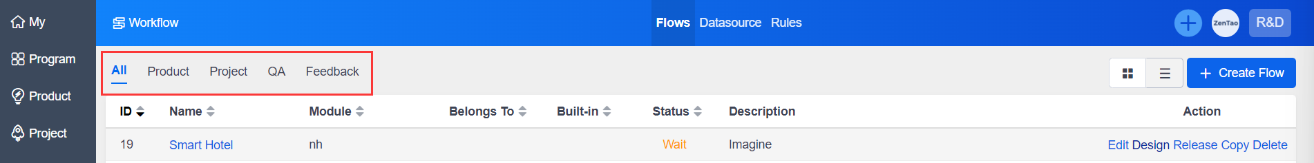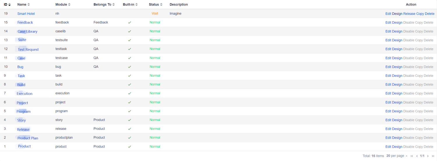 As for now, Workflow has 15 built-in processes based on the usage process of ZenTao, the functional modules, and the customization needs, including product view, product plan, release, requirement/story, program, project, execution, build, task, bug, case, test request, suite, case library, and feedback.