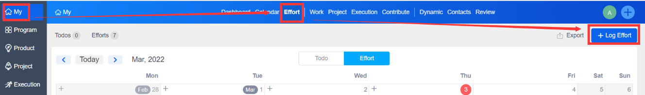 Go to "My" -- "Effort" -- "Log Effort" to create a work log.