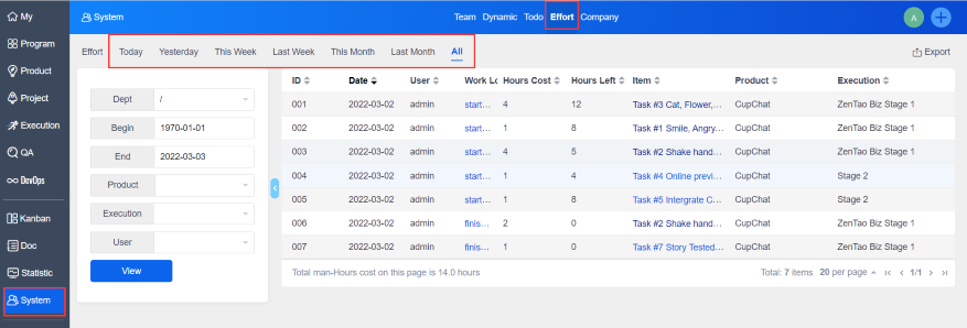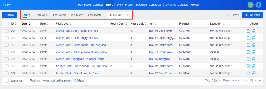 - Logs can be exported to CSV format in ZenTao Open-source Series with the extension Effort integrated.