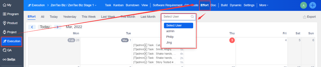 Go to "Execution" -- "Effort" to view the team member's execution logs.