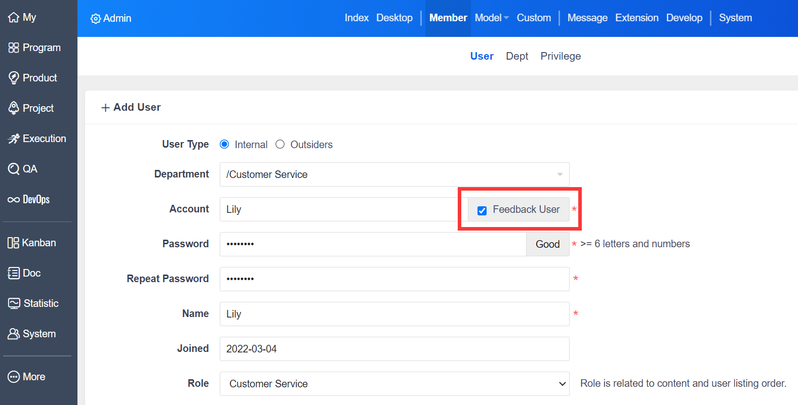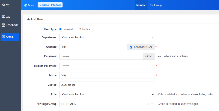 Feedback Interface: Go to "Admin" -- "Member" -- "Add User" and tick the box of "Feedback User".