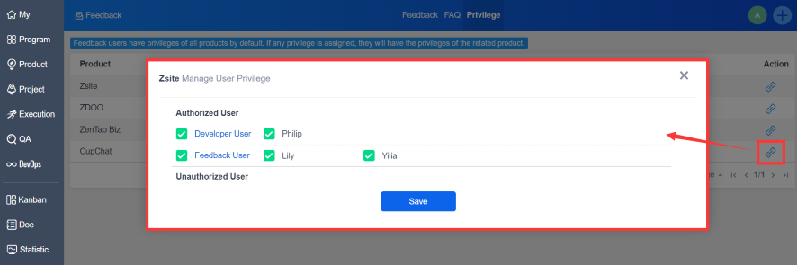 Click "Manage User Privilege" of the product to set the authorized user and unauthorized user. Give an example to explain the logic, only when user A is one of the authorized users of product B, can A create the feedback of product B.