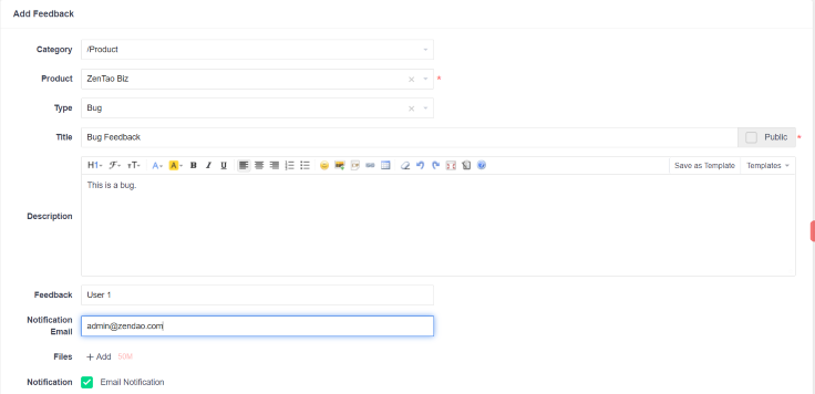 - If the box of Public is ticked, all the ZenTao users are available to access the feedback.