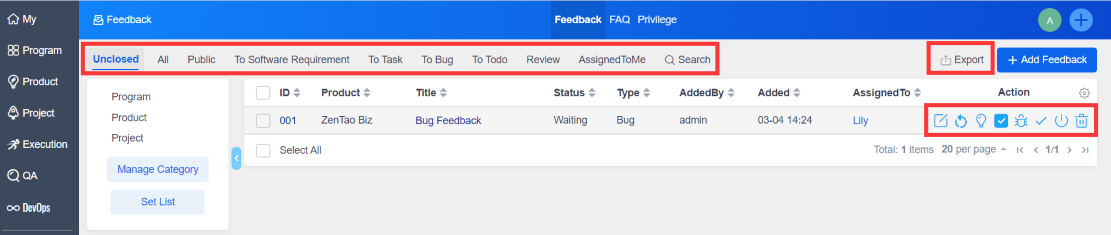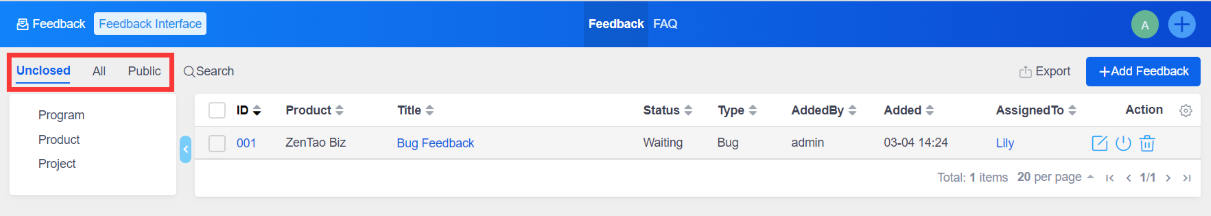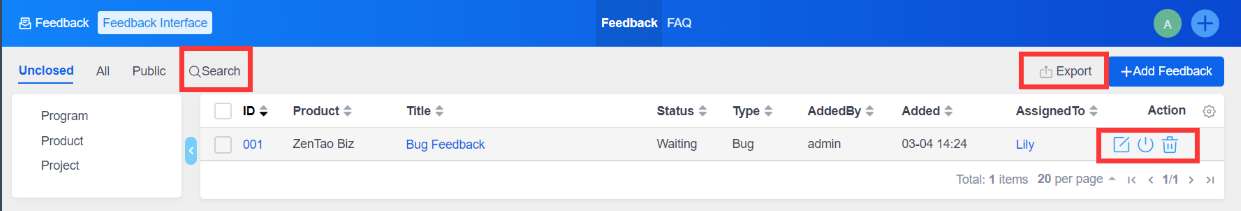 The newly created feedback will be shown in the feedback list. It is available for you to edit, close, or delete the feedback. You can also search by different criteria and export the feedback.