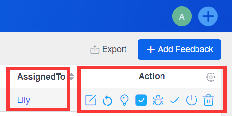 The assignee manages the feedback by clicking the buttons in the Action column.
