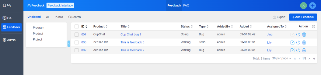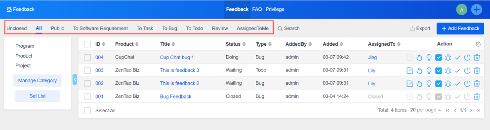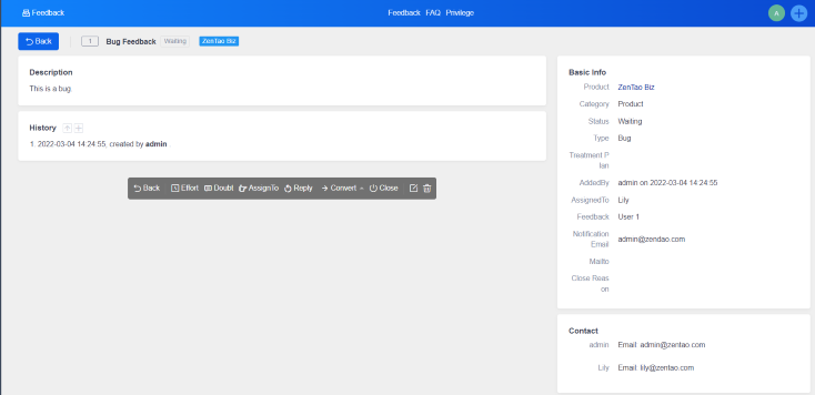 The feedback feature of ZenTao Biz can be used to manage after-sales service and technical support for delivered products. For example. you can set the company internal staff like customer service staff as feedback users to submit customer issues and comments. It is also capable to set company external members such as A-parties and partners of custom projects as feedback users to submit product-related issues. For the submitted issues, R&D staff can directly reply, turn into requirements or turn into bugs.