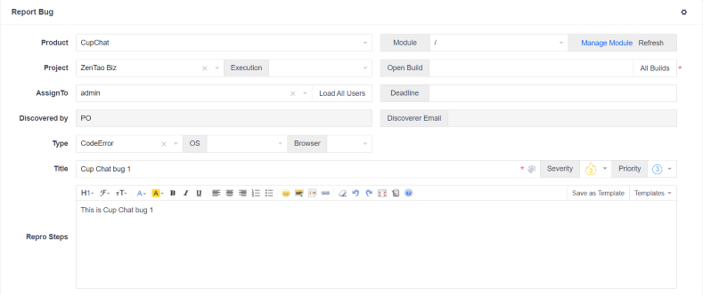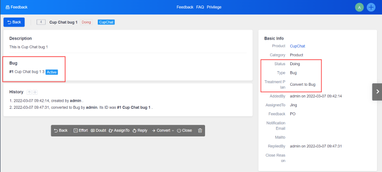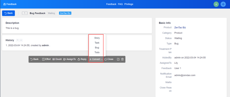 The operation of "To Story" and "To Task" is almost the same as "To Bug". Next, we will introduce how to turn the feedback into bug in detail.