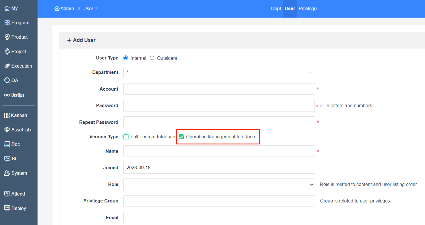 To create lite users in the Full Feature Interface, we need to go to Admin - User - Add User, and only tick the box of "Operation Management Interface".