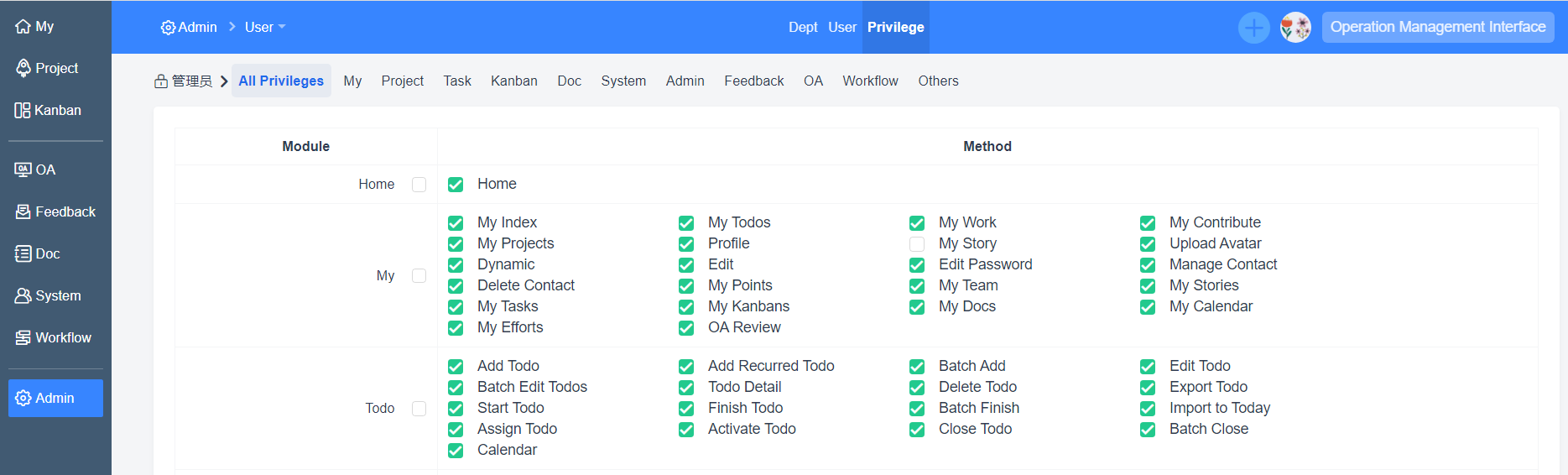Go to Operation Management Interface - Admin - Privilege to manage the permission.