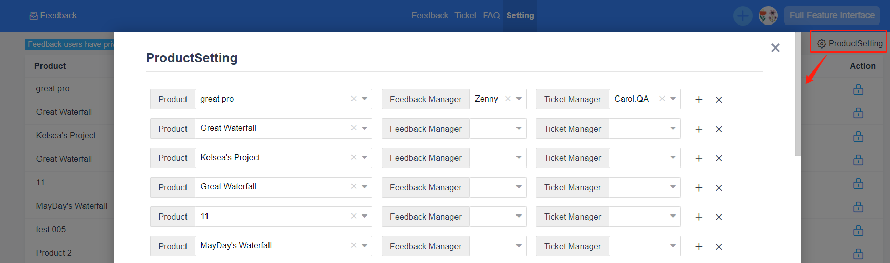 Go to Full Feature Interface - Feedback - Setting to configure the products that users are allowed to provide feedback on and specify the responsible person for managing the feedback.
