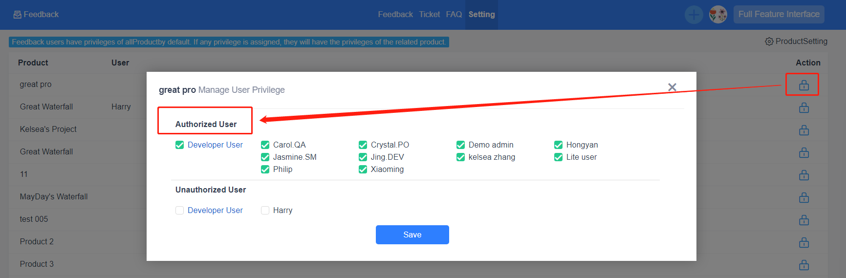 Go to Full Feature Interface - Feedback - Setting to configure the authorized users for feedback submission.