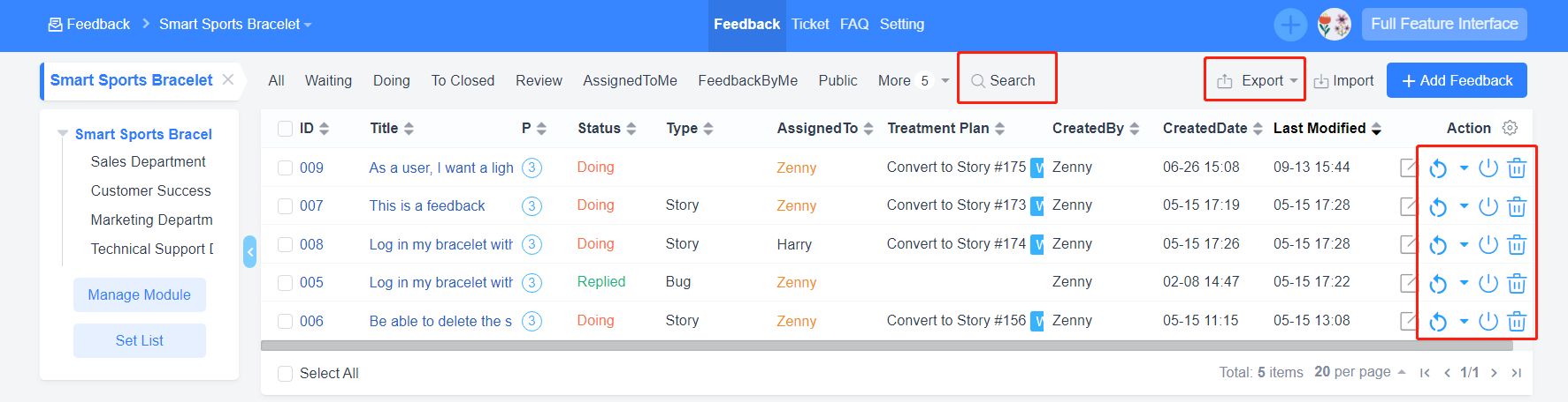 Furthermore, users have the option to filter and view feedback based on specific criteria via the search function. To extract feedback data, simply click on the Export button located in the upper right corner.