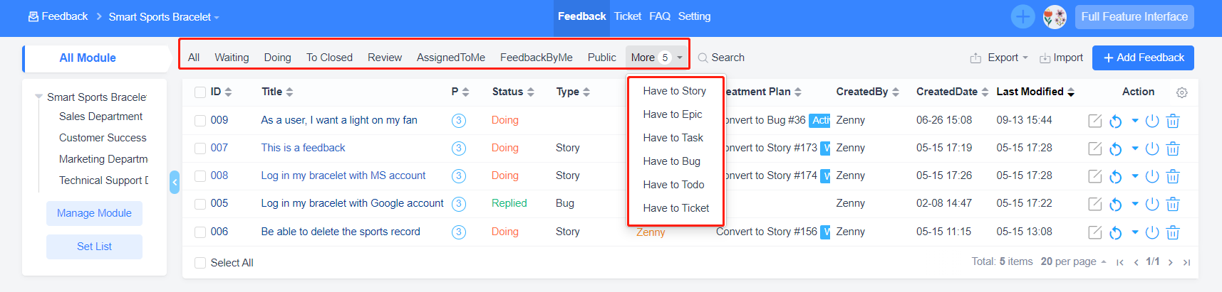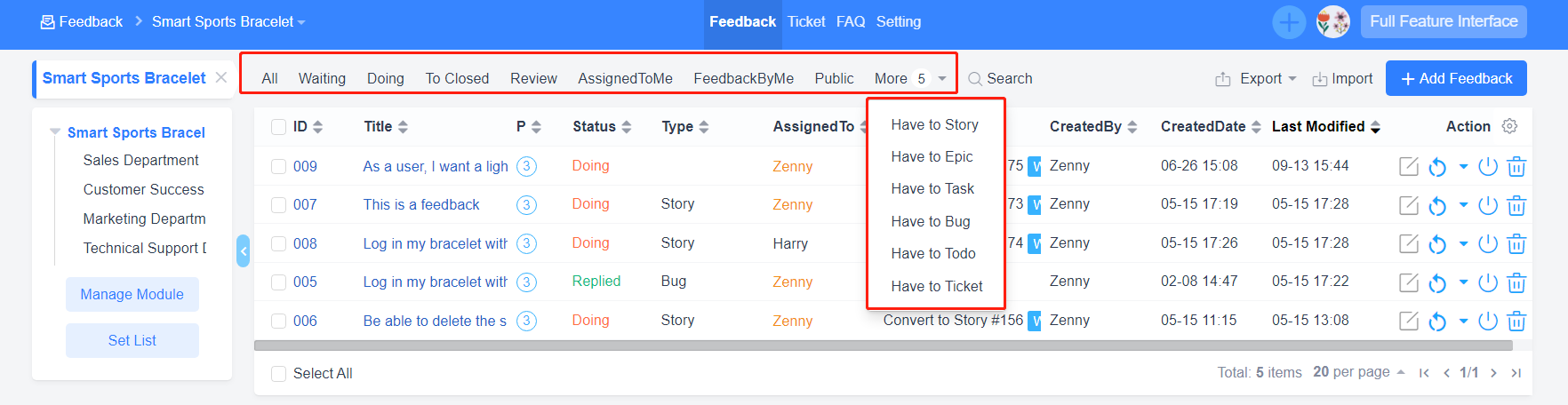 Feedback can be converted to Ticket, Story, Epic, Task, Bug, and Todo by clicking on "Convert".
