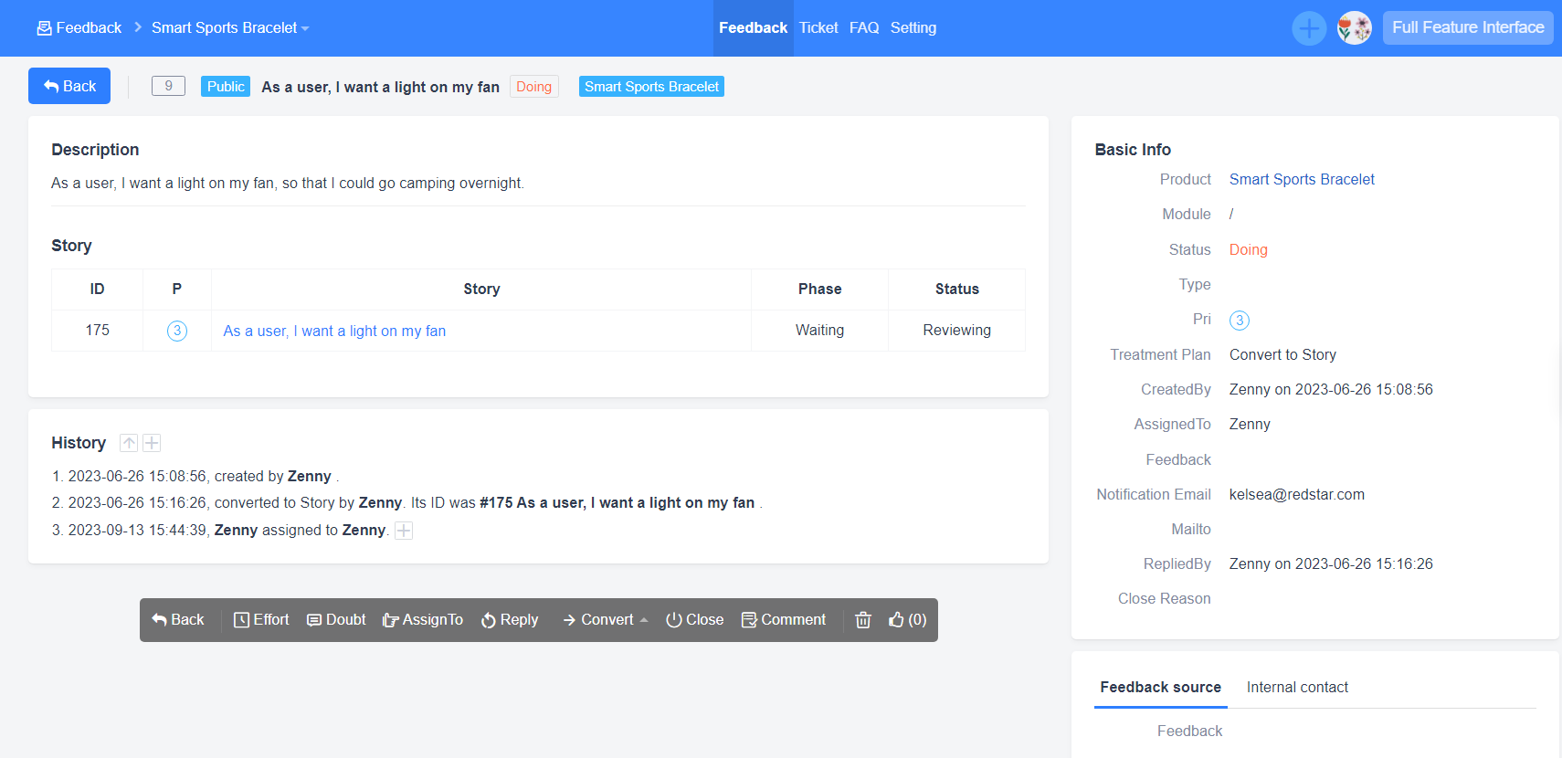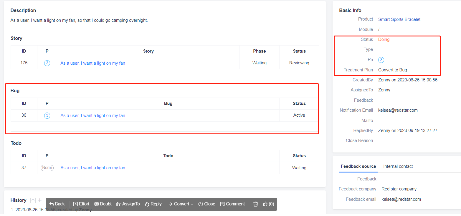 Once the conversion to a bug is successful, you can view the bug information on the feedback details page.