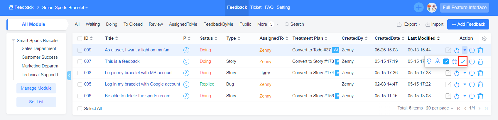 When feedback is converted to bugs, requirements, or tasks, its status changes from "waiting" to "doing". To mark it as "closed", you need to manually click the close button.