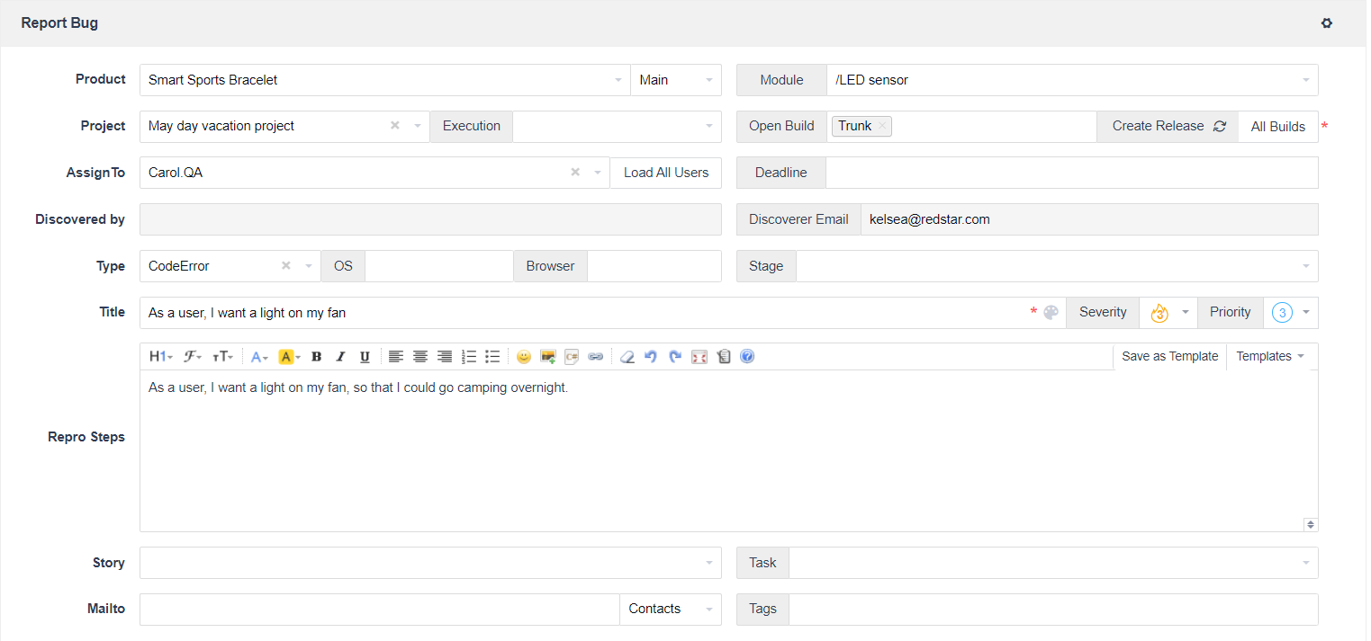 To convert feedback into a bug, simply click the "To Bug" button in the feedback action bar. The bug will inherit the product associated with the feedback, and the user and email information from the feedback will also be synchronized.