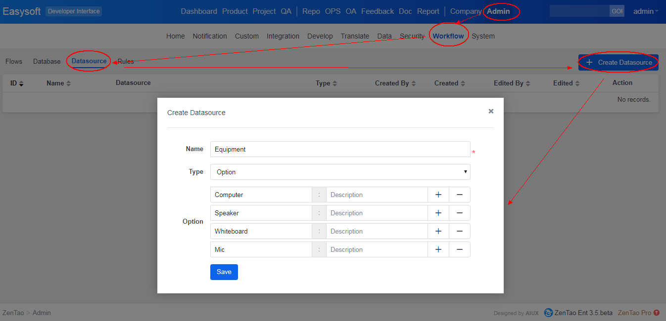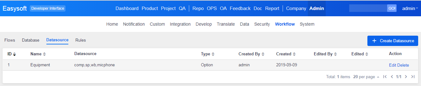 Go to Admin->Workflow->Datasource->Create Datasource.
