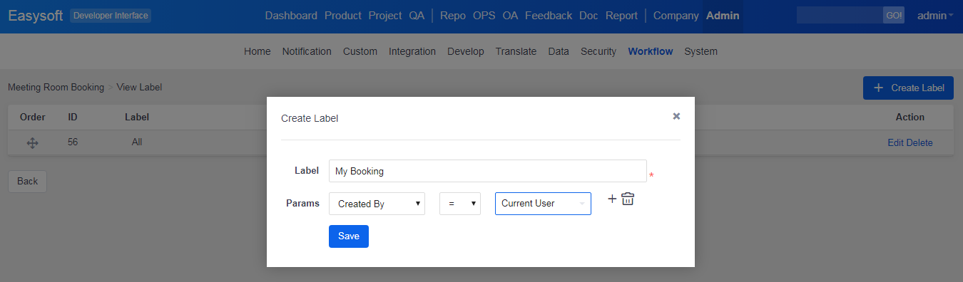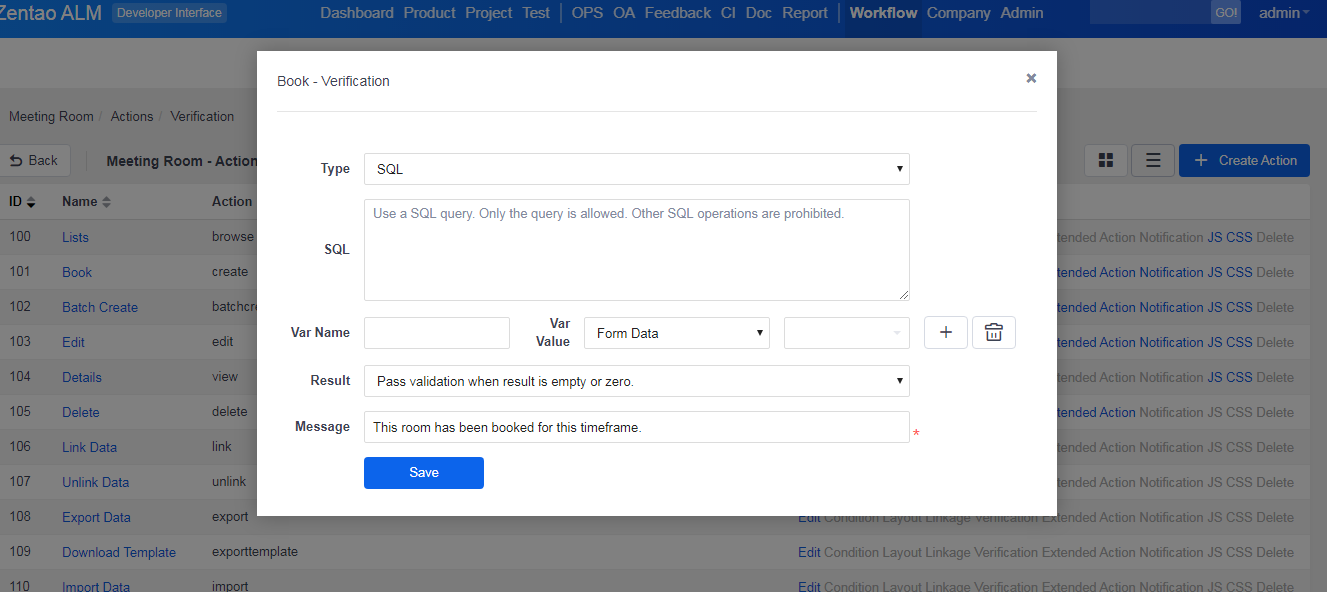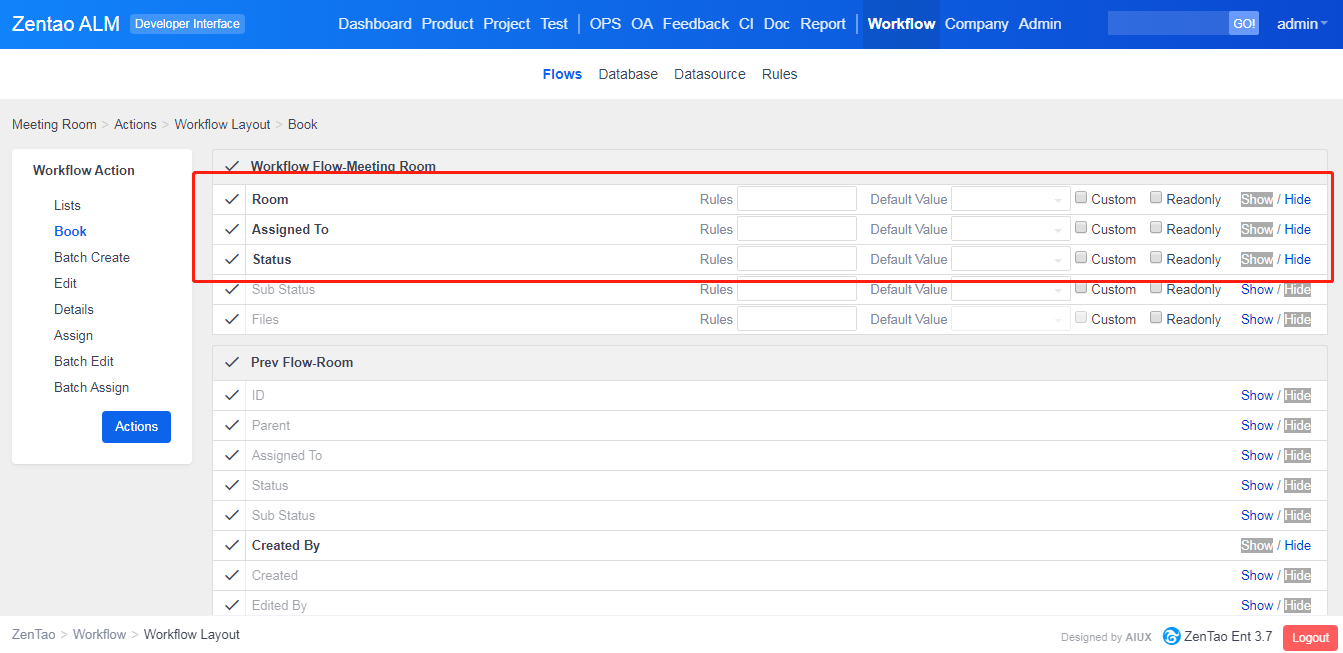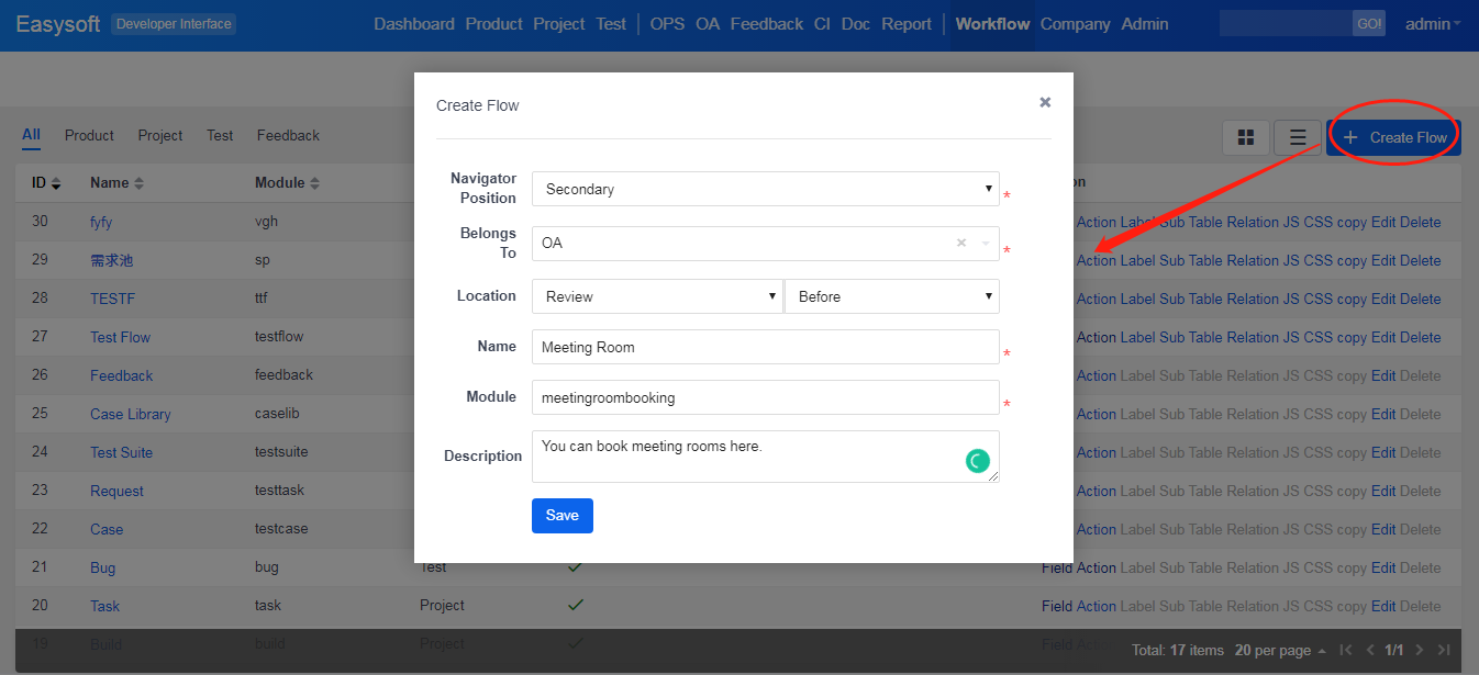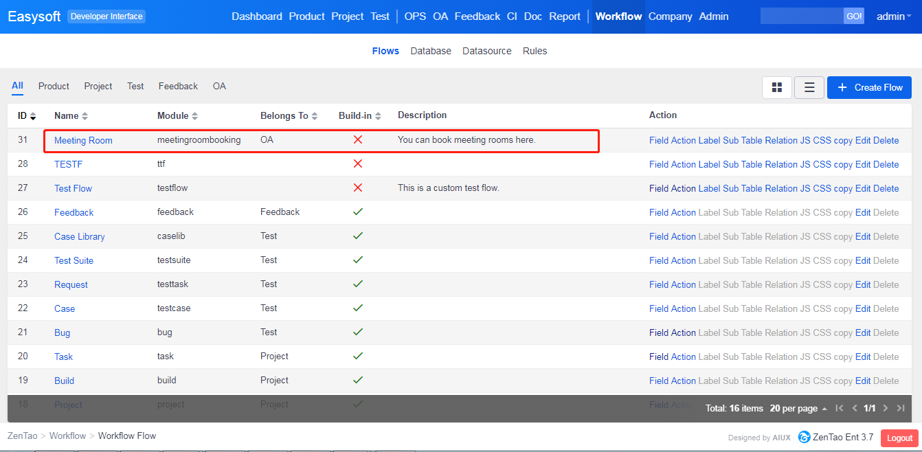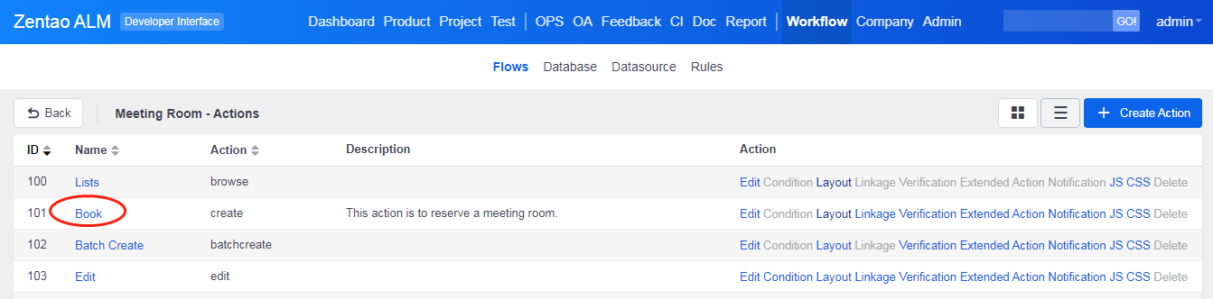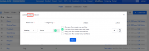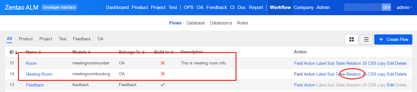 Take Meeting Roomas an example to add a new workflow for it. Meeting Room is the workflow, and Add Room is its Relation. Relation is to set cross-workflow relations.