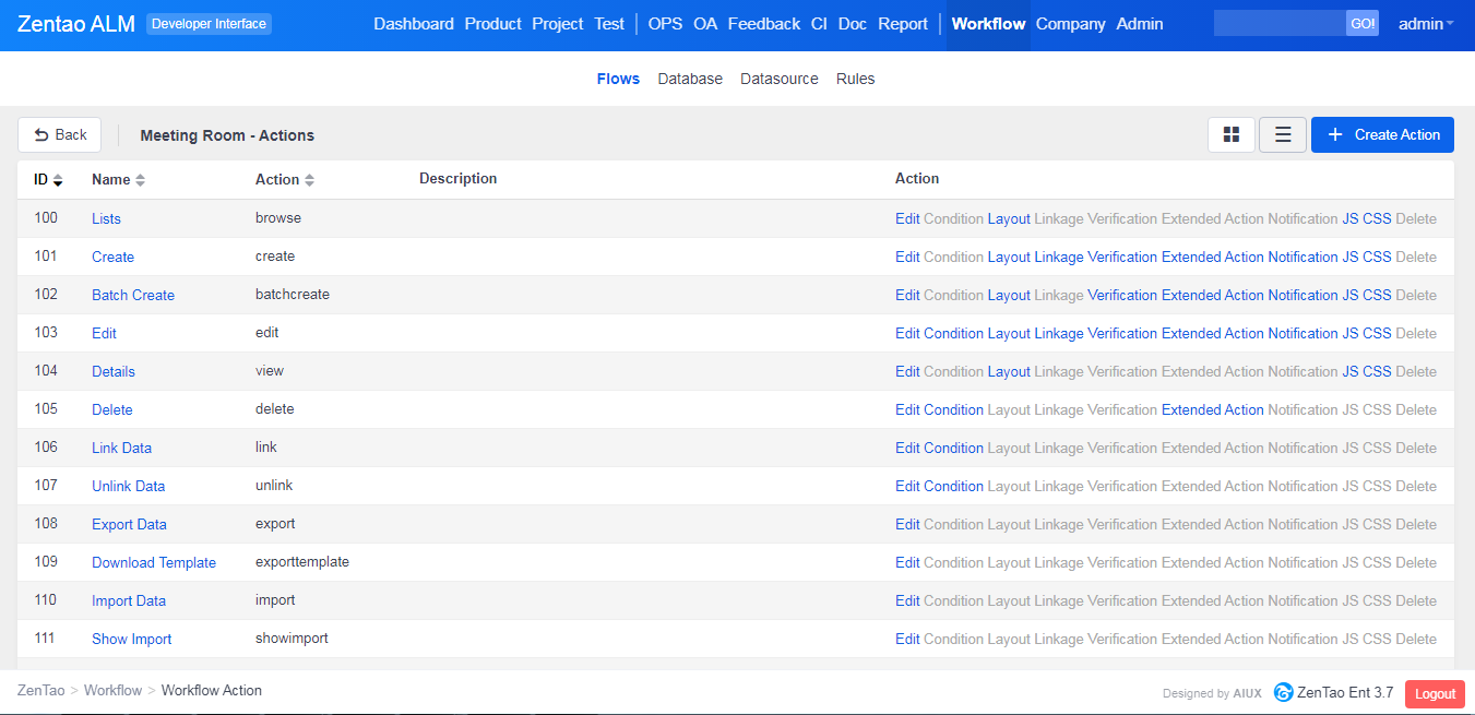 Below is the default action list. You can edit the action or add a new action according to your requirements.
