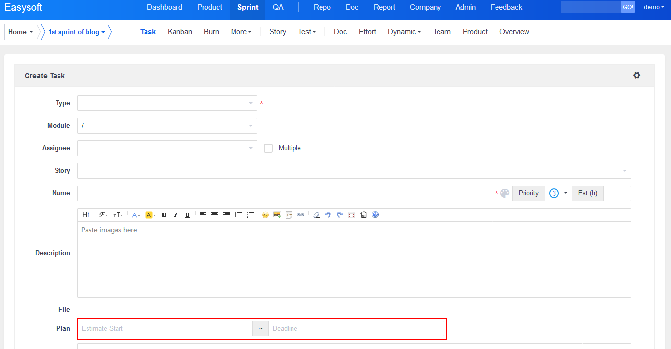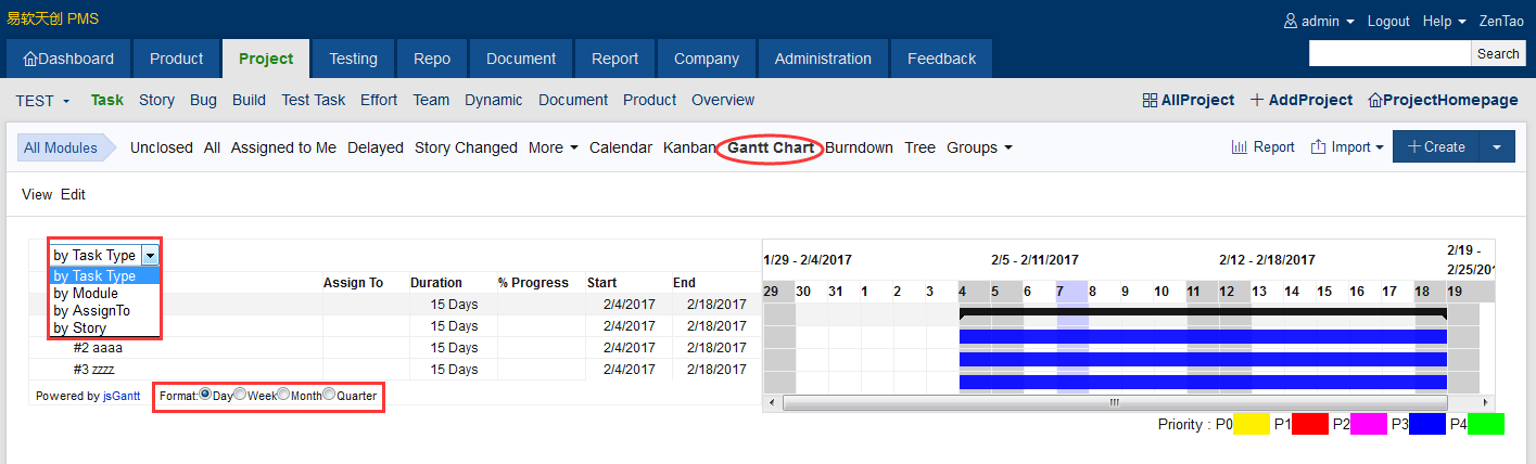 Gantt chart can be viewed by tags such as Task Type, Module, AssignTo, and Story. It can also be displayed by days, weeks, months, or quarters.