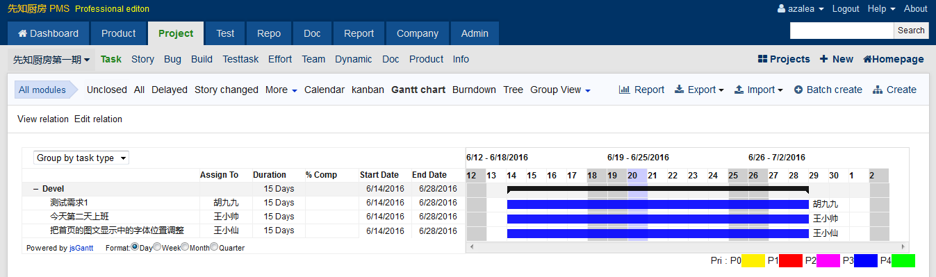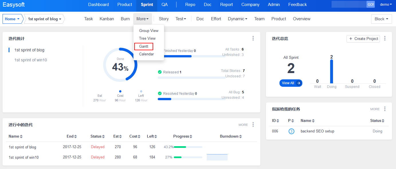 Gantt chart is one of robust features in ZenTao. It offers an intuitive view of the progress of the project.