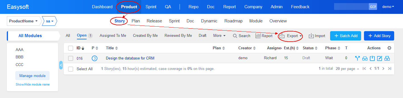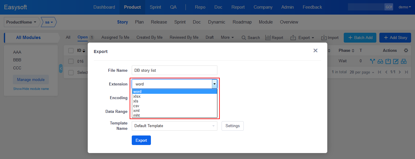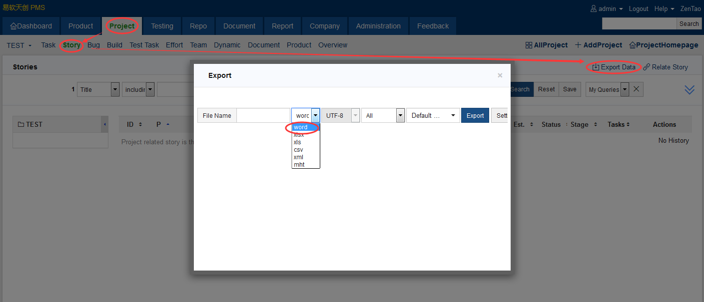 Note: Currently, only Product->Story and QA->Report can be exported as Word files. Task/Bug/Case can't be exported for now.If an ima