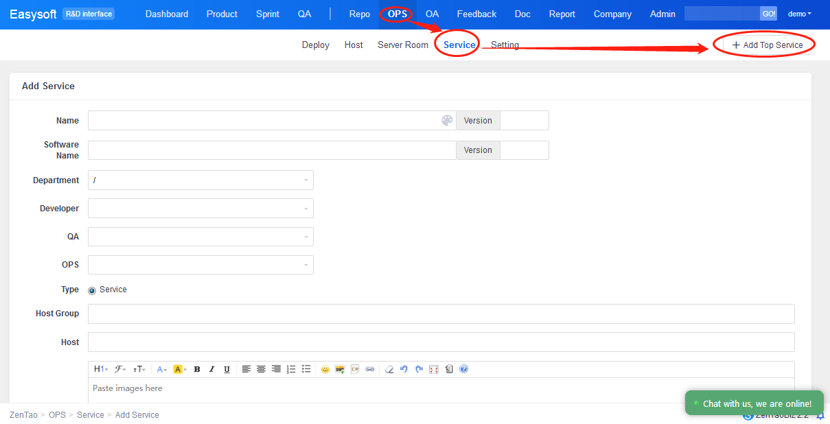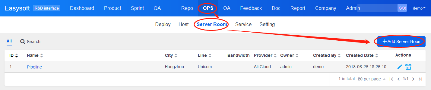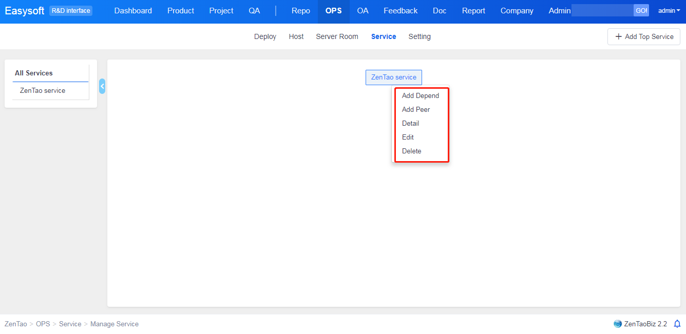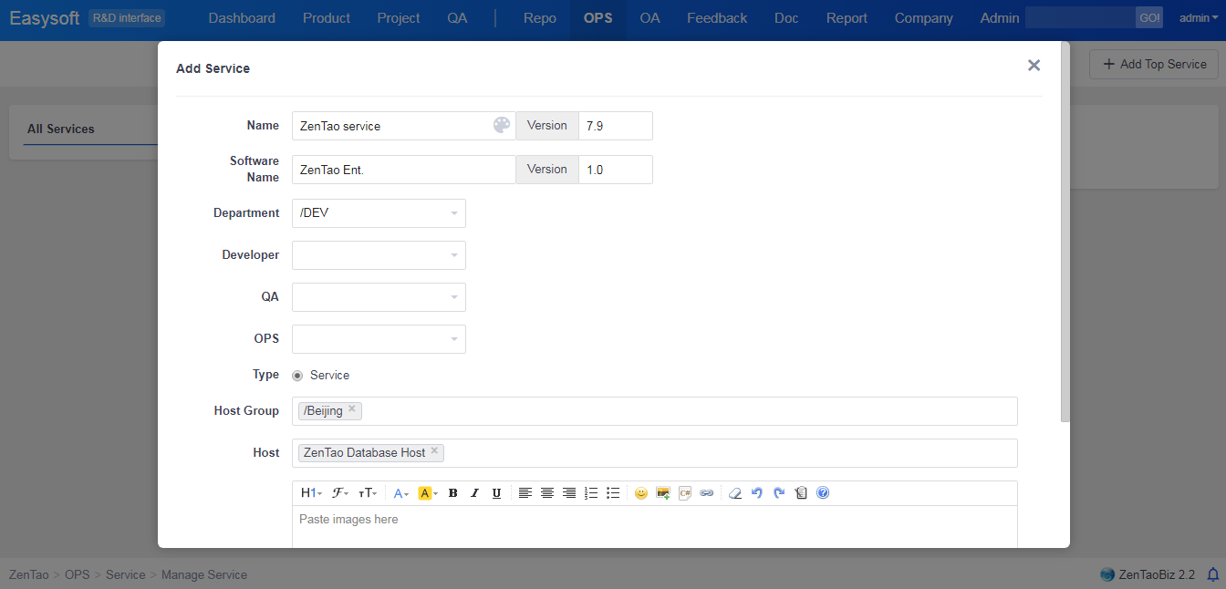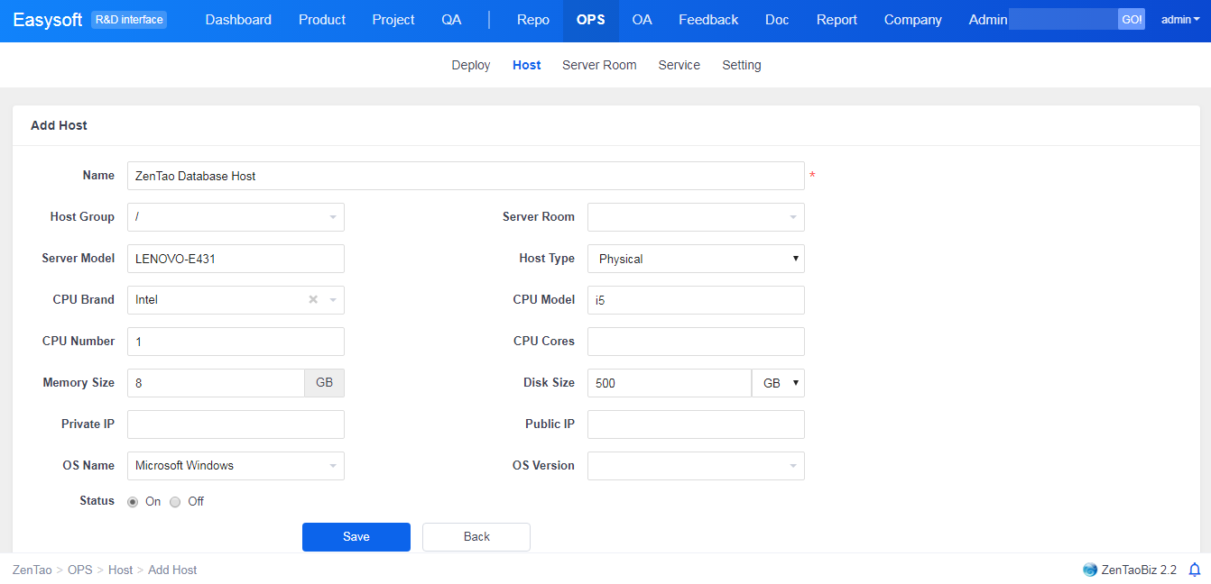 Go to OPS in ZenTao and add service providers, locations, CPU brands, system versions, WebServer, database, languages, and stages of releases according to your situation. It is suggested that users configure the information mentioned above first, and then add the information of hosts, machine room, and services.