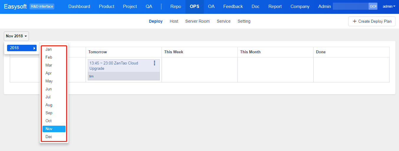 Click the drop-down to choose the month and the year to check the deployment. After adding a deployment, you can check it through tabs, such as Today, Tomorrow, This Week, This Month, and Done.
