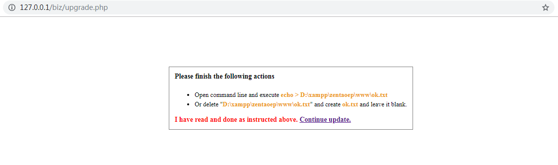 5.1 Visit ZenTao, and start upgrading. For example, the address to visit ZenTao is http://127.0.0.1:81/zentao, so enter http://127.0.0.1:81/zentao/upgrade.php in the browser, so the upgrade will be started.