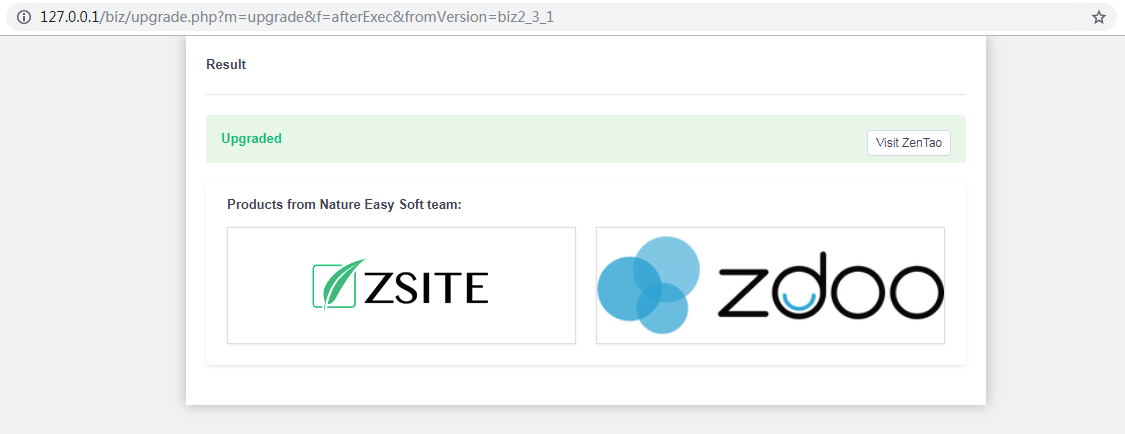 If you see the page below, your upgrading is finished. Click Visit ZenTao to start your ZenTao Biz. The address to visit ZenTao Enterprise is the same.