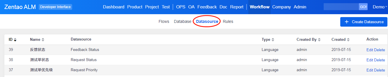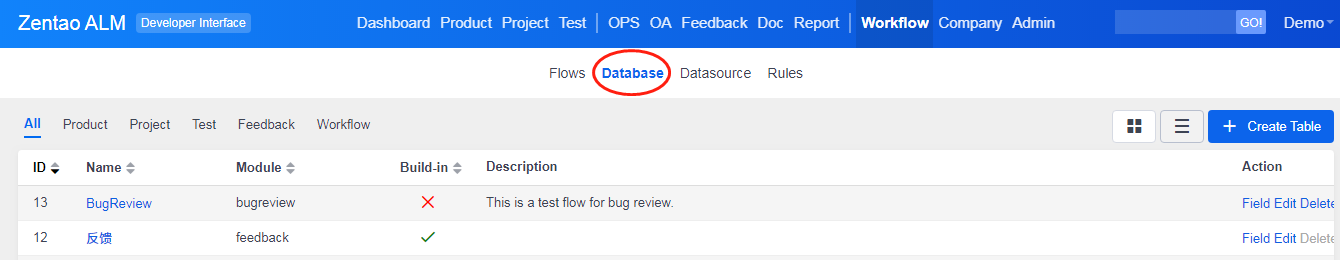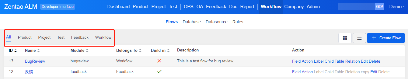 Flow is developed based on workflows, features, and customization in ZenTao, and has built in 12 workflows, namely Product, Plan, Release, Story, Project, Build, Task, Bug, Case, Request, Suite, and Feedback.