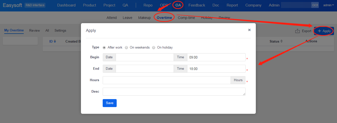 Go to OA->Overtime and click the Apply button at the upper right of the page. Choose the type of overtime, the begin and end time, and add the reason you have to do overtime.